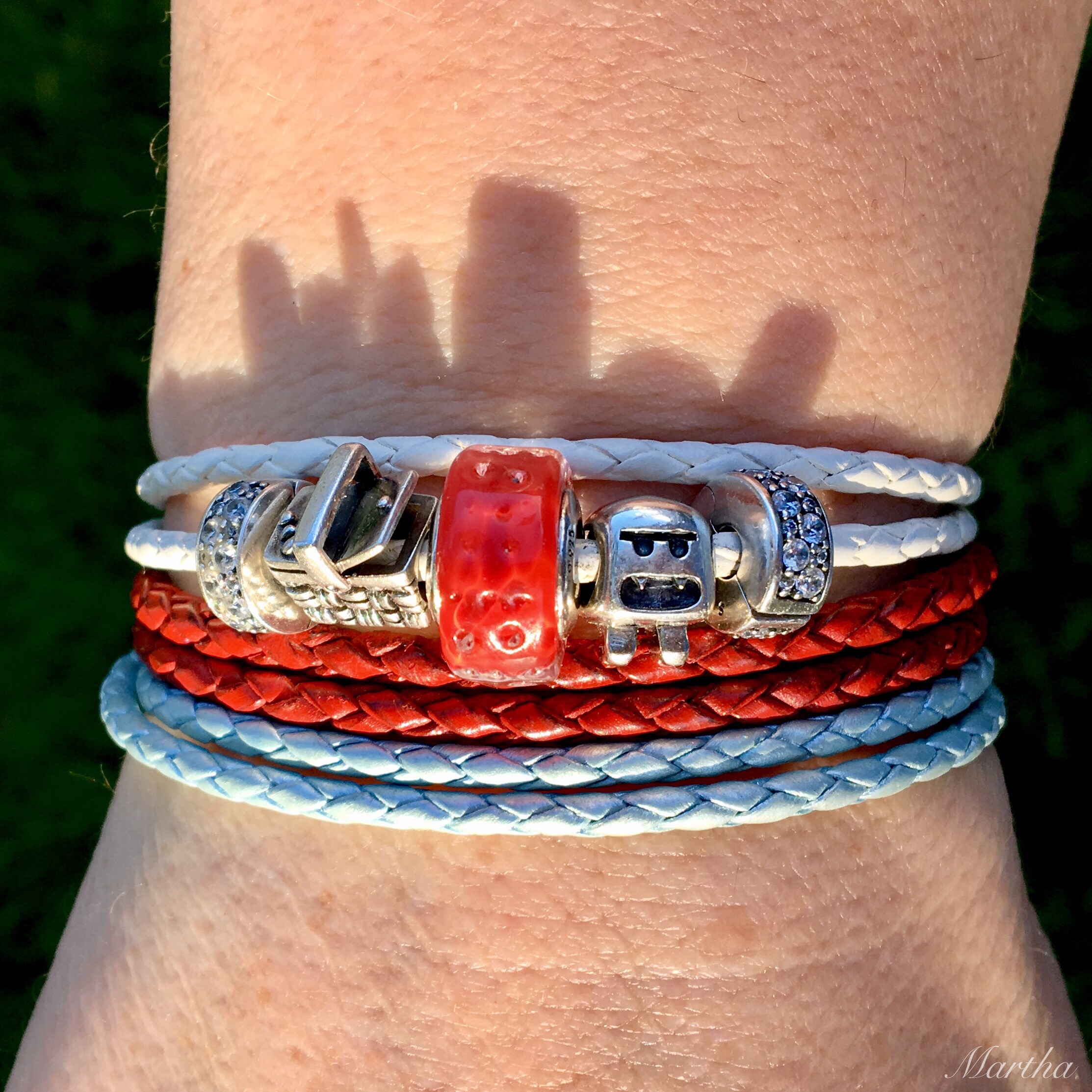 The white leather bracelet is really lovely, Martha! It looks amazing with so many different shades! The teal combo is my absolute favorite! The Teal Fascinating and Teal Lattice muranos really pop! I also love your Sock Monster combo! It REALLY does look like a cityscape on your wrist! Lol!ππππ