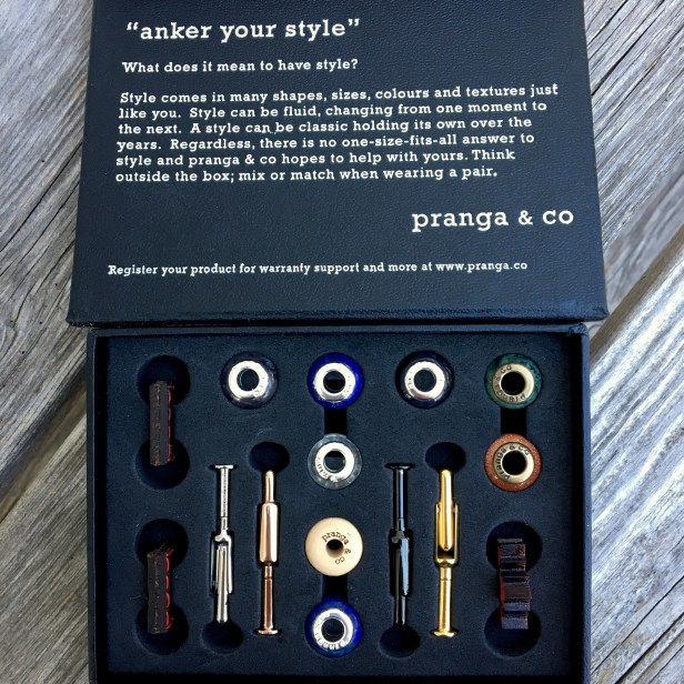 Today I’ve got something a little different to show- beadable cuff links for the guys! Invented by a Canadian, I was quite intrigued when the owner contacted me and I thought they were a clever idea. You can see a video showing how they work on the pranga & co website, but for those of us used to changing our bracelets all the time the idea is simple: just twist off part of the cuff link in order to customize it by adding an ‘anker’. The ankers come in a variety of materials such as leather, glass, semi-precious stones and wood. Here is what the box looked like on the inside.