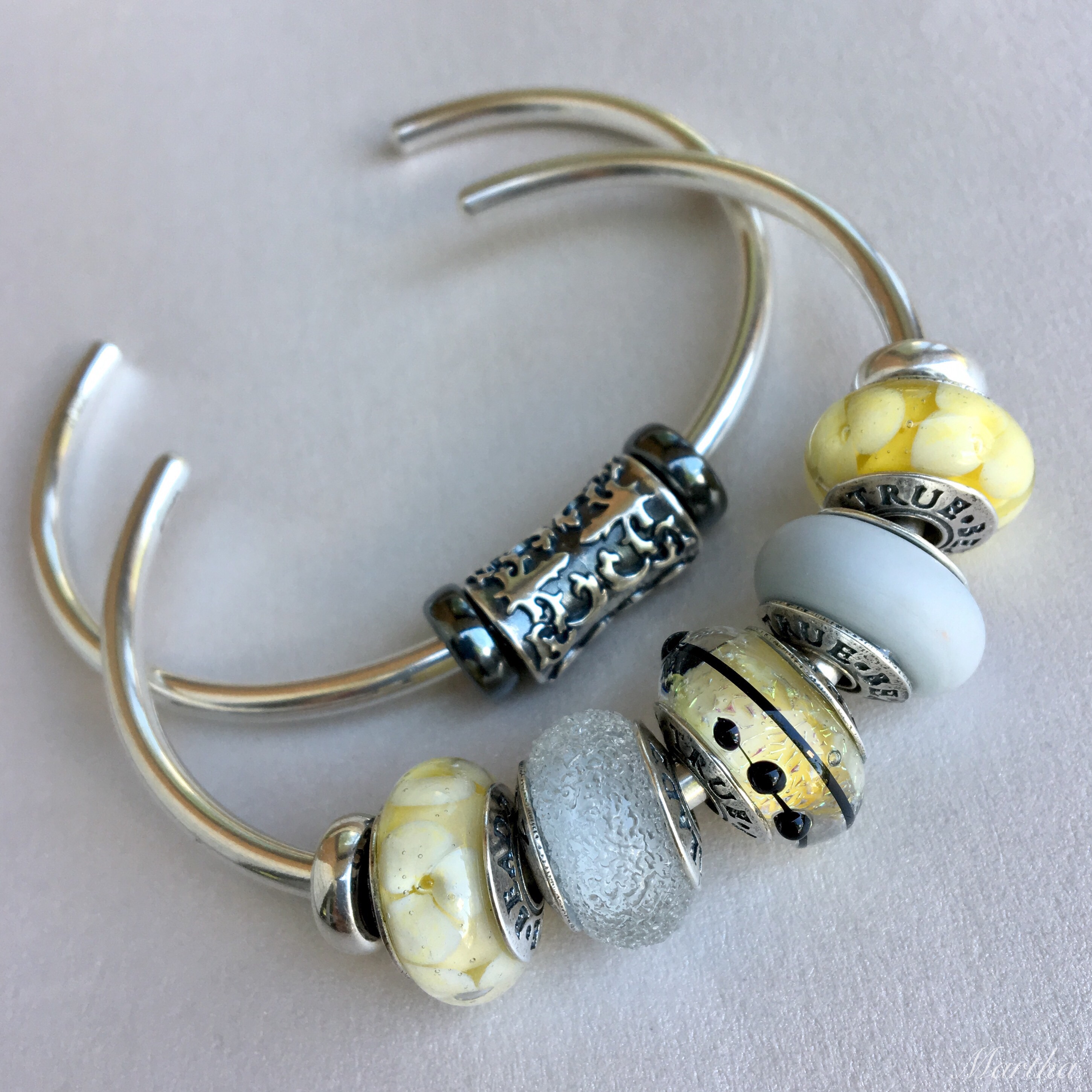 I wanted to match up the Shadow colour with some other colours from the True Beadz collection and the first combo I liked was with a soft yellow called Sunlight Spot. Just a note, two of the Dragon Shadow shapes do not fit on a Trollbeads bangle, numbers 8 and 10 from above. It’s like the Trollbeads Deep Ocean, they are too long to go round the curve. Julia says all three shapes fit on a Pandora bangle though. I don’t have a Pandora bangle, so couldn’t try it out. The yellow and black bead in the middle is a True Treasure.