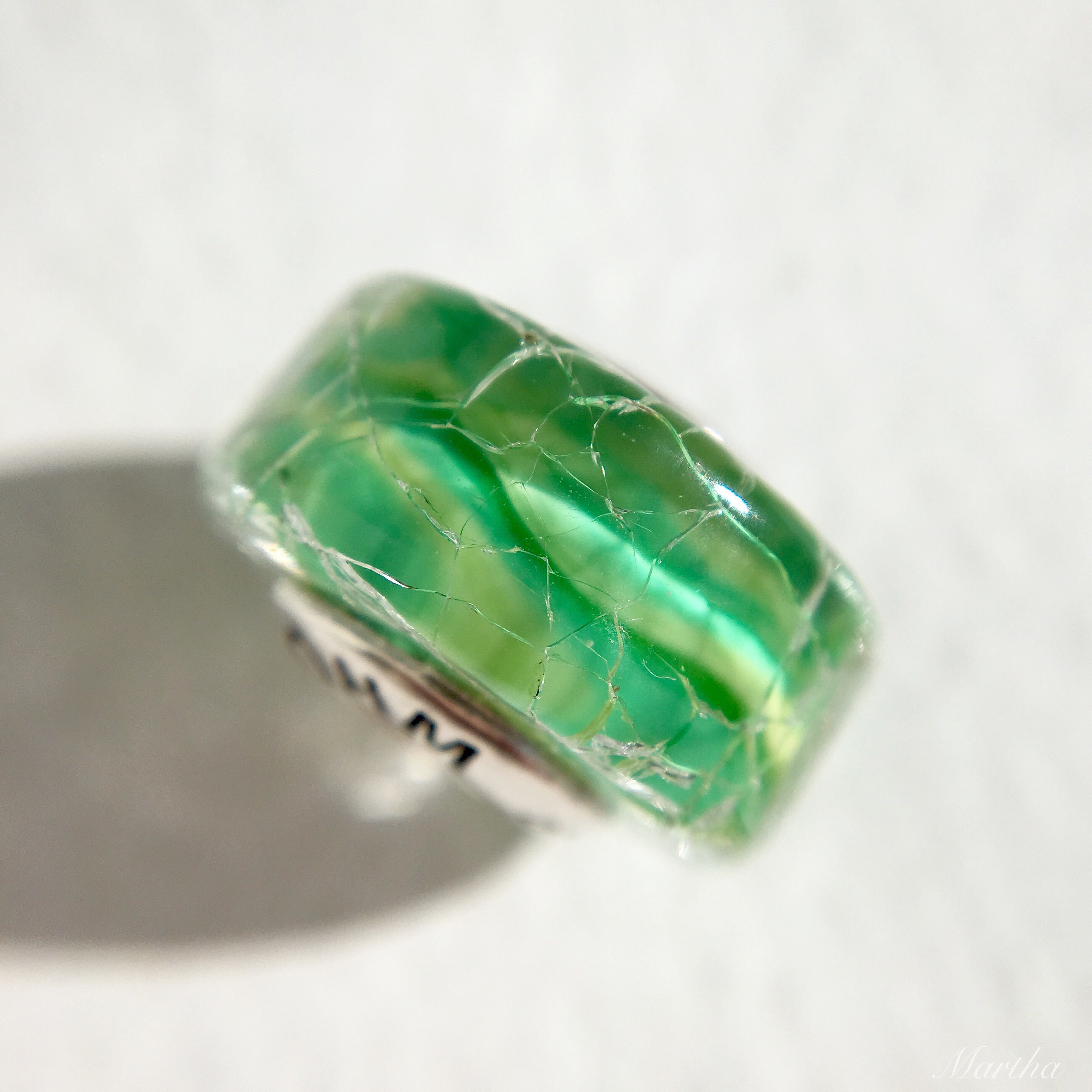 The bead is the barrel shape and even thought it looks broken, you don’t have to worry about it. There is a fine layer of glass, I believe, over the cracks so nothing gets caught. It’s a really cool effect. The glass is limited edition, so if you want it don’t leave it for a year or anything. It is so pretty with different shades of green and maybe even a little yellow in there.