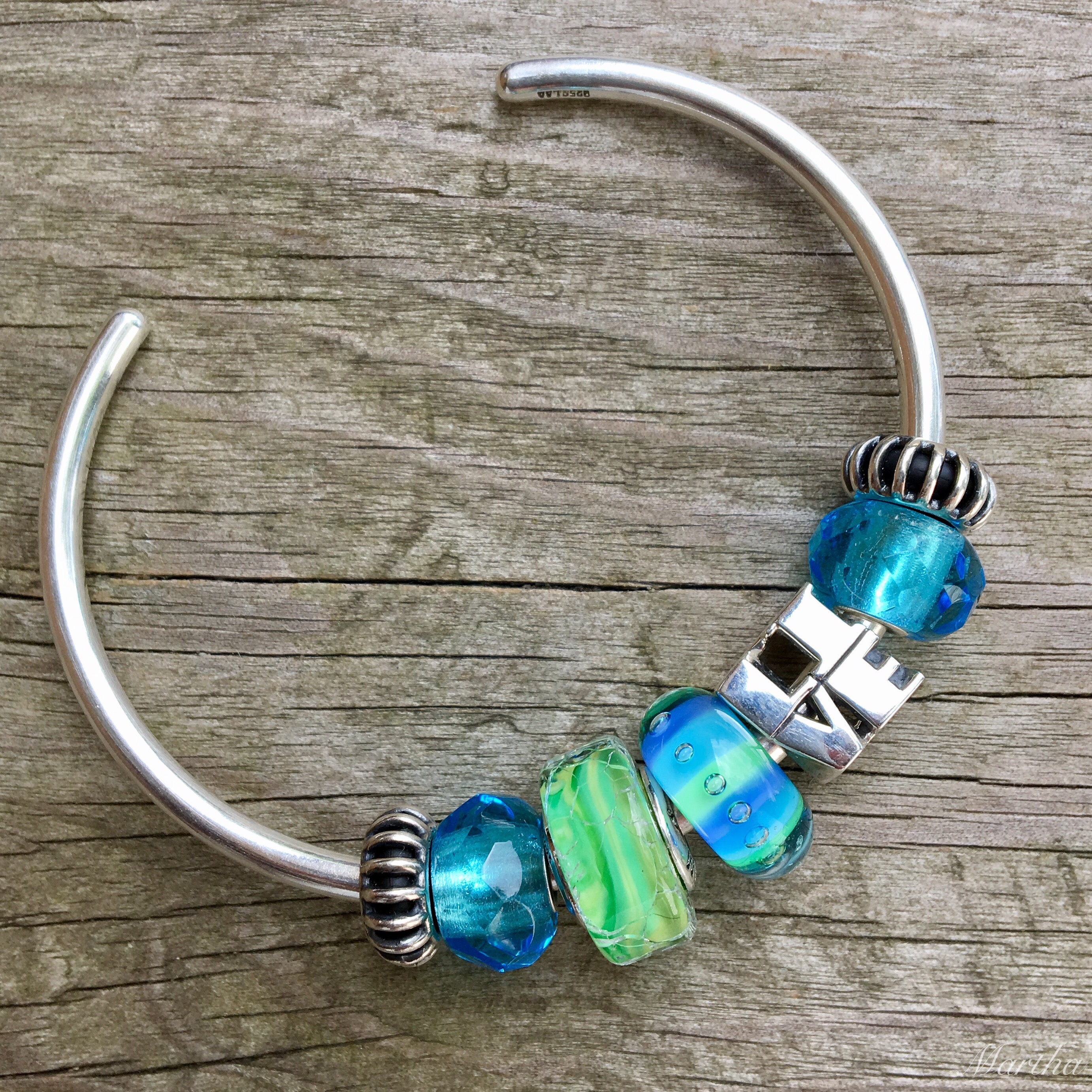 I had a mess of beads in my little corner of our breakfast bar in the kitchen and the Trollbeads Seabed Stripe was sitting right there. It looked like the green stripe matched the Green Crack and then I added in the Light Turquoise Prisms. Since I had one barrel shaped bead and one traditional shaped one, I decided to put the silver Live bead off to the side.