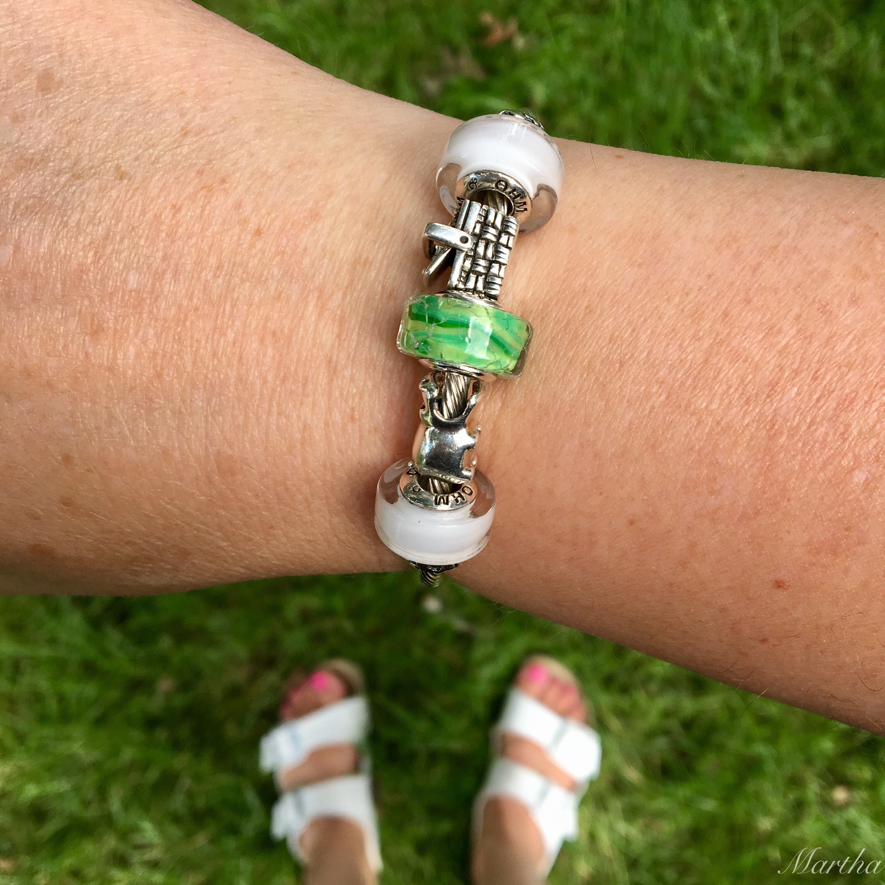 Here is a green and white bangle with Growling Hippo and Picnic Basket. Since Cold Milks are no longer available a good substitute would be True Beadz True Air Siberia.