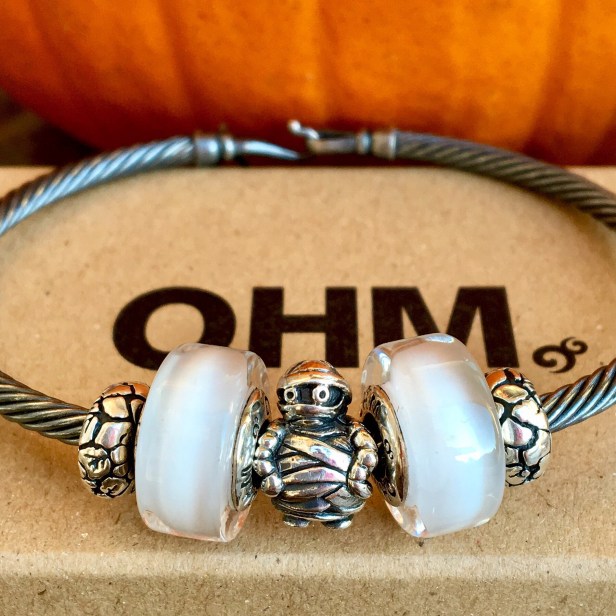 Last week was a feature on Hallowe’en themed Trollbeads and now it’s time for Ohm Beads. There are lots of regular Ohm Beads that work especially well at Hallowe’en, but this year sees the release of several that are particularly thematic. Some of the new beads are Invisible Man ($45 USD), Mummy ($45 USD), Trick or Treat ($95 USD), Dirty Magic ($65 USD), Mech Tech 2E ($30 USD), Chained 2E ($30 USD), Hot Topic ($30 USD), Magic ($30 USD), Shroom ($30 USD) and Quill ($30 USD).