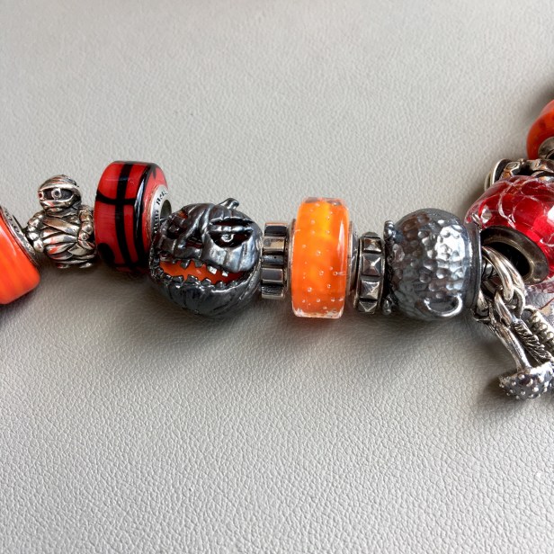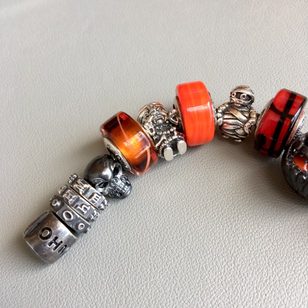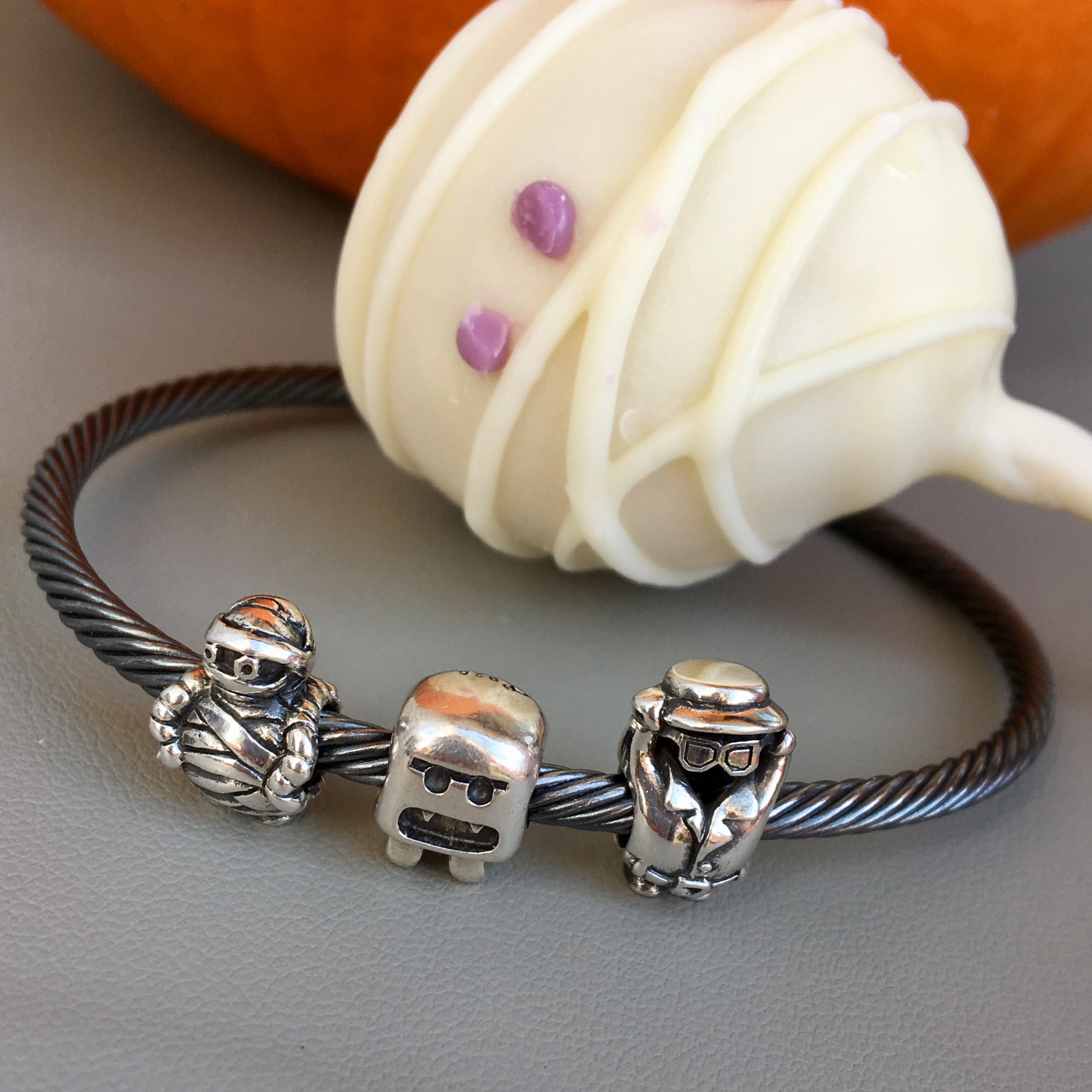 I did a poll on Instagram asking who was cuter, Mummy or Invisible Man. Mummy won by a landslide so it gets to be the first picture, ha ha! I love the eyes on it. It’s worth noting that these will all fit on Pandora bracelets, if you’re a Pandora person longing for a Hallowe’en bead or two. Silver beads like this are so versatile and this little guy would go with any bracelet. Here I’ve used a couple of Cold Milk beads.
