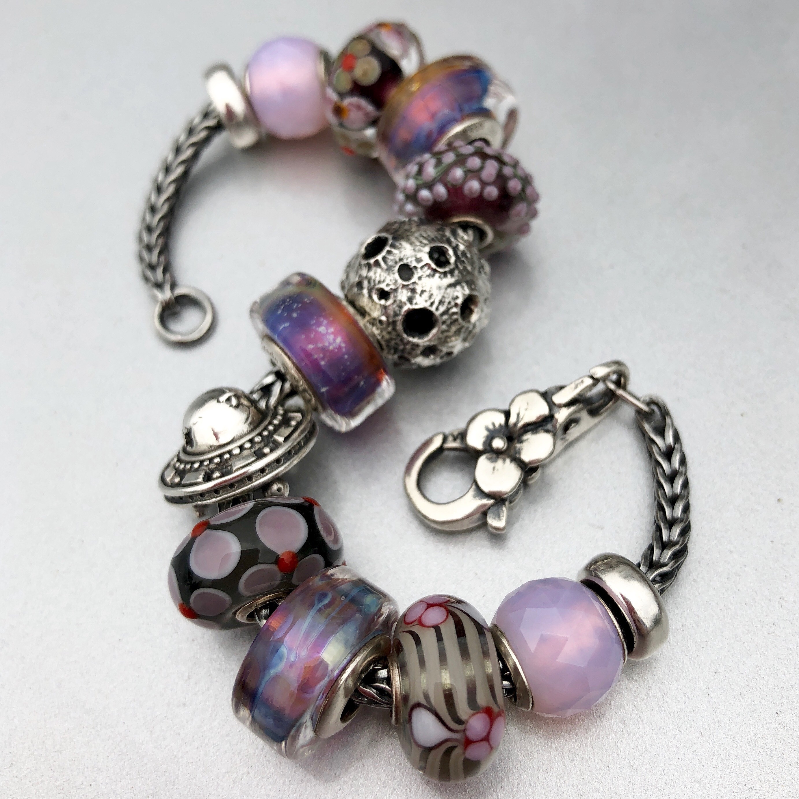 I haven’t done a blog post in a while but most definitely have been making and wearing bracelets! Here’s a look at what’s been catching my fancy lately. This is yesterday’s bracelet of Ohm Beads and Trollbeads Uniques with a couple of Pandora beads.