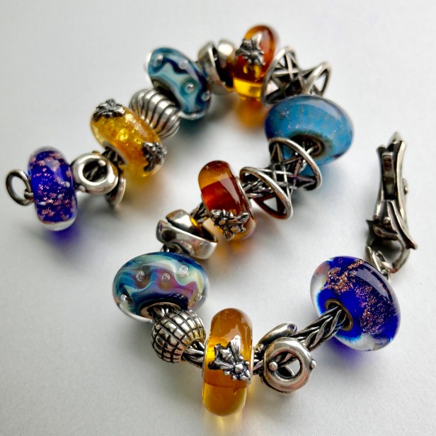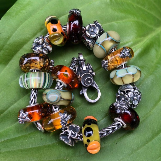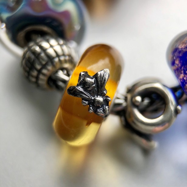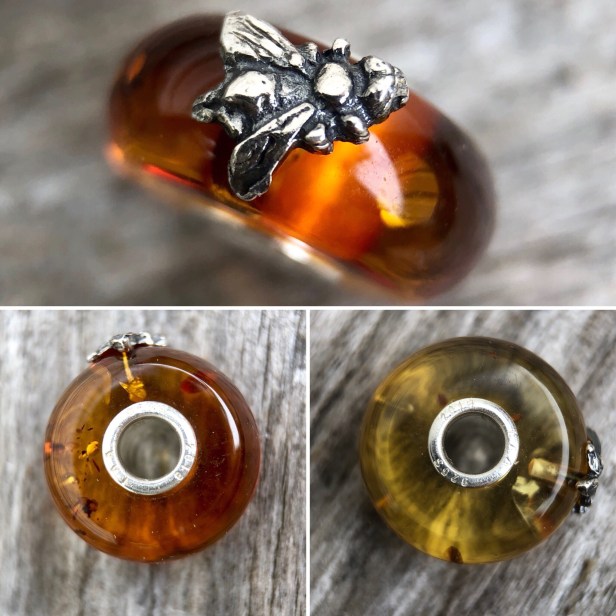 Last year’s Trollbeads Day bead was the gorgeous Golden Rutilated Quartz, shown below in the middle. This year’s bead is not as expensive and I’ll add in the price when I get it. There are beads with one silver insect ($75 USD) and beads with two ($115 USD) and a kit of 10 for $750 USD, which has 9 beads with one insect each and one bead with two insects. The amber varies in colour, of course. I’m quite partial to the maple syrup coloured one second from the right.