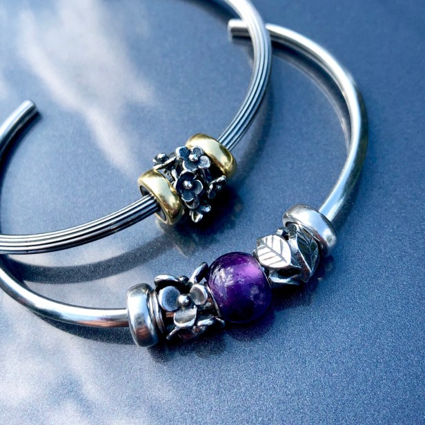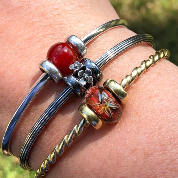 It is really delicate and petite and looks awesome stacked as a pair in between the gold spacers. On the bangle in front is another new silver bead called Leaves of Grace ($39 USD), also designed by Søren Nielsen.