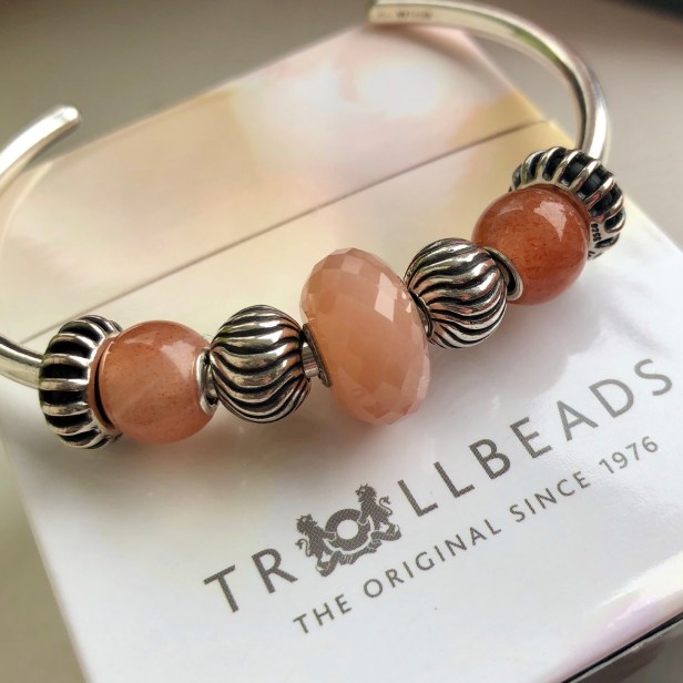 I made up a bracelet based on a promo shot from Trollbeads. I don’t have any gold beads so put in a couple of Pink Prisms to brighten things up.