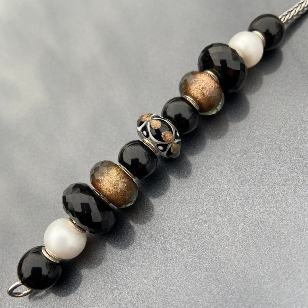 I also like it with Daylight Brilliance from Black Friday of 2016. I’ve added in last year’s Black Friday bead, Snowflake Obsidian Facet Bead and a Smoky Quartz Bead.