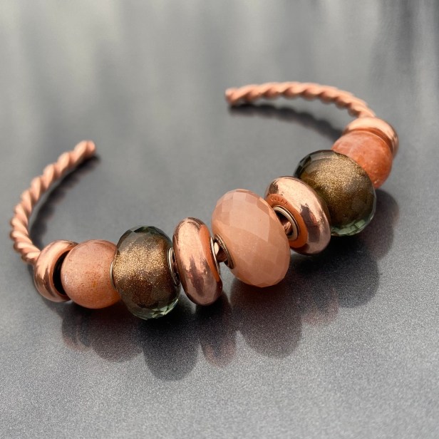 Of course, it looks really good with copper. This almost has a retro feel to it with the Feldspar Moonstone and the two Round Sunstone Beads.