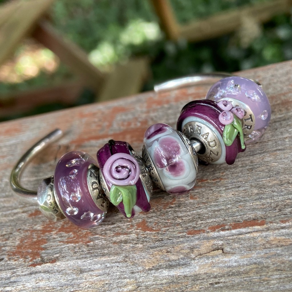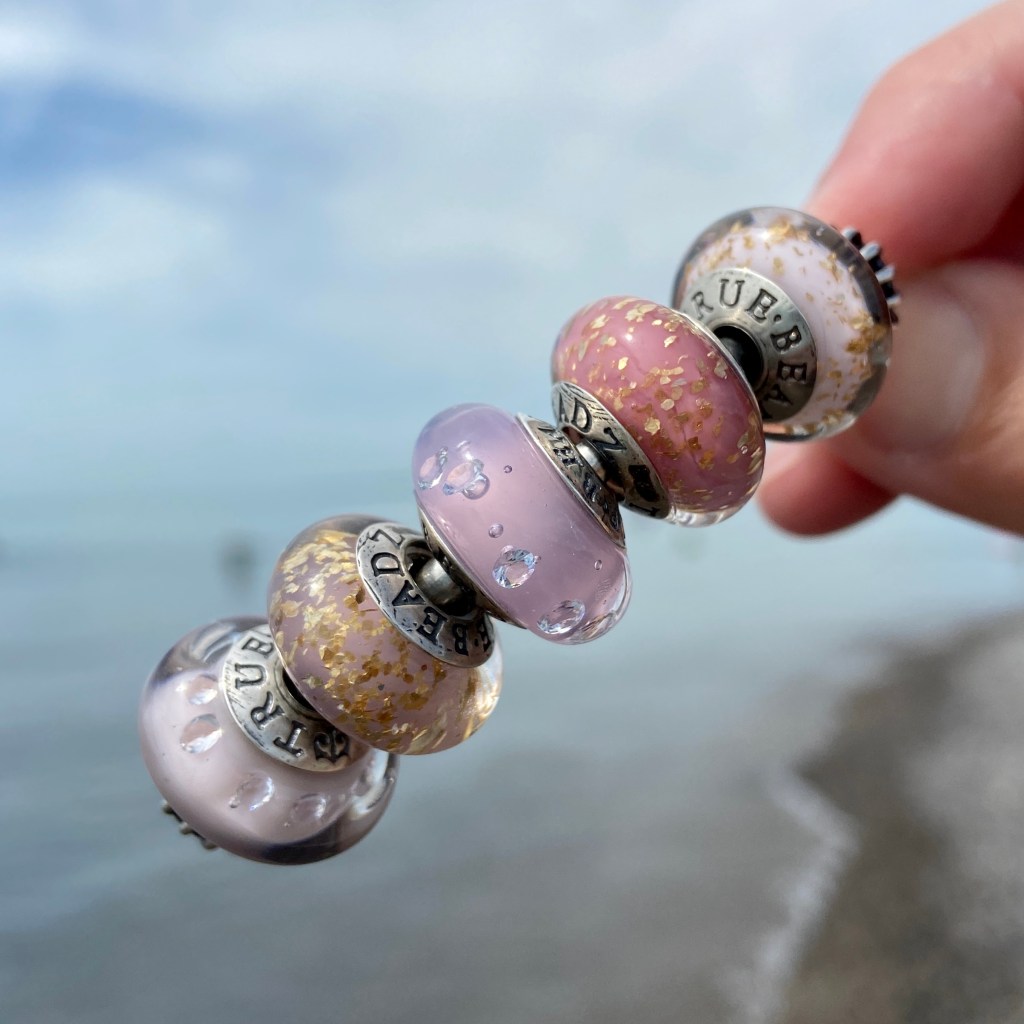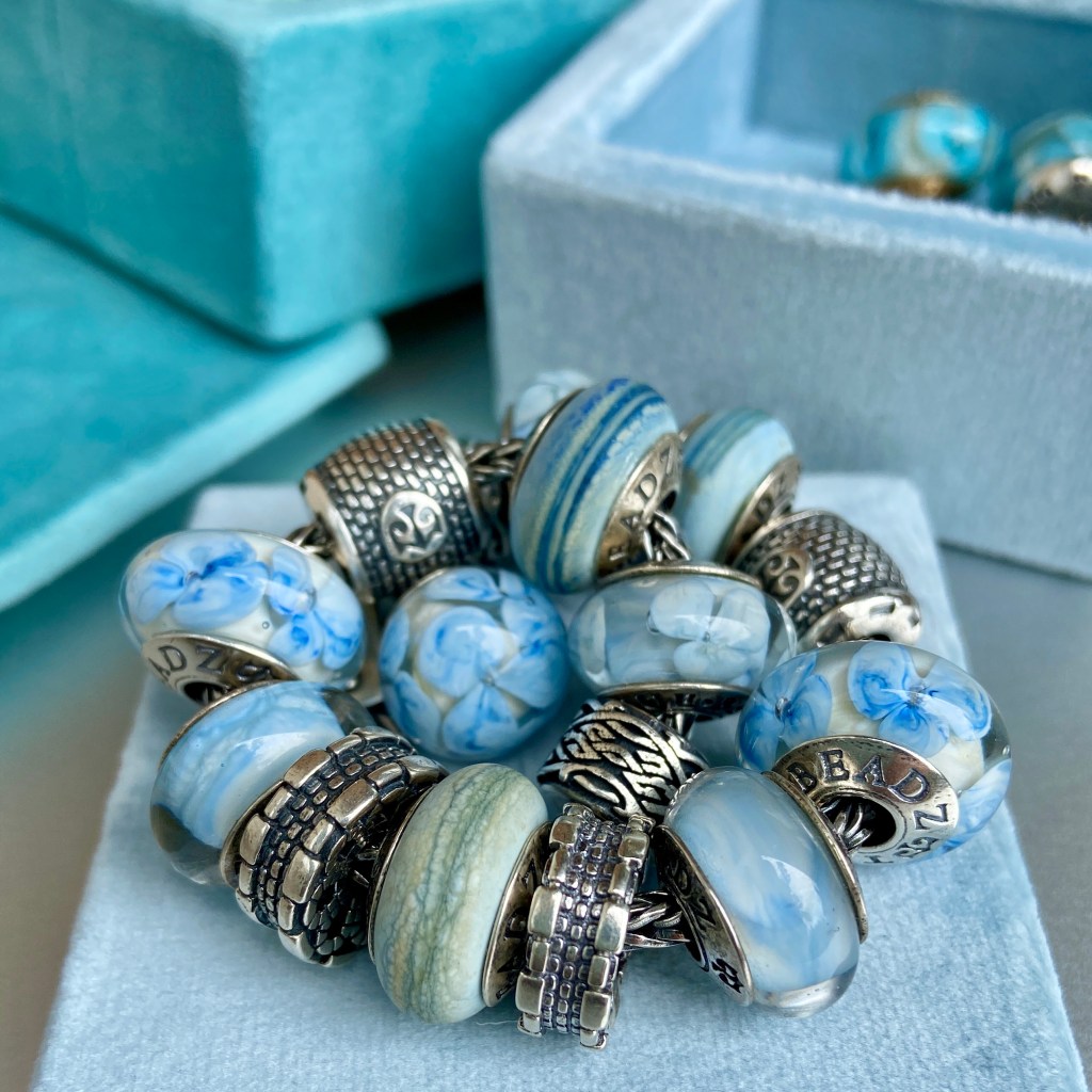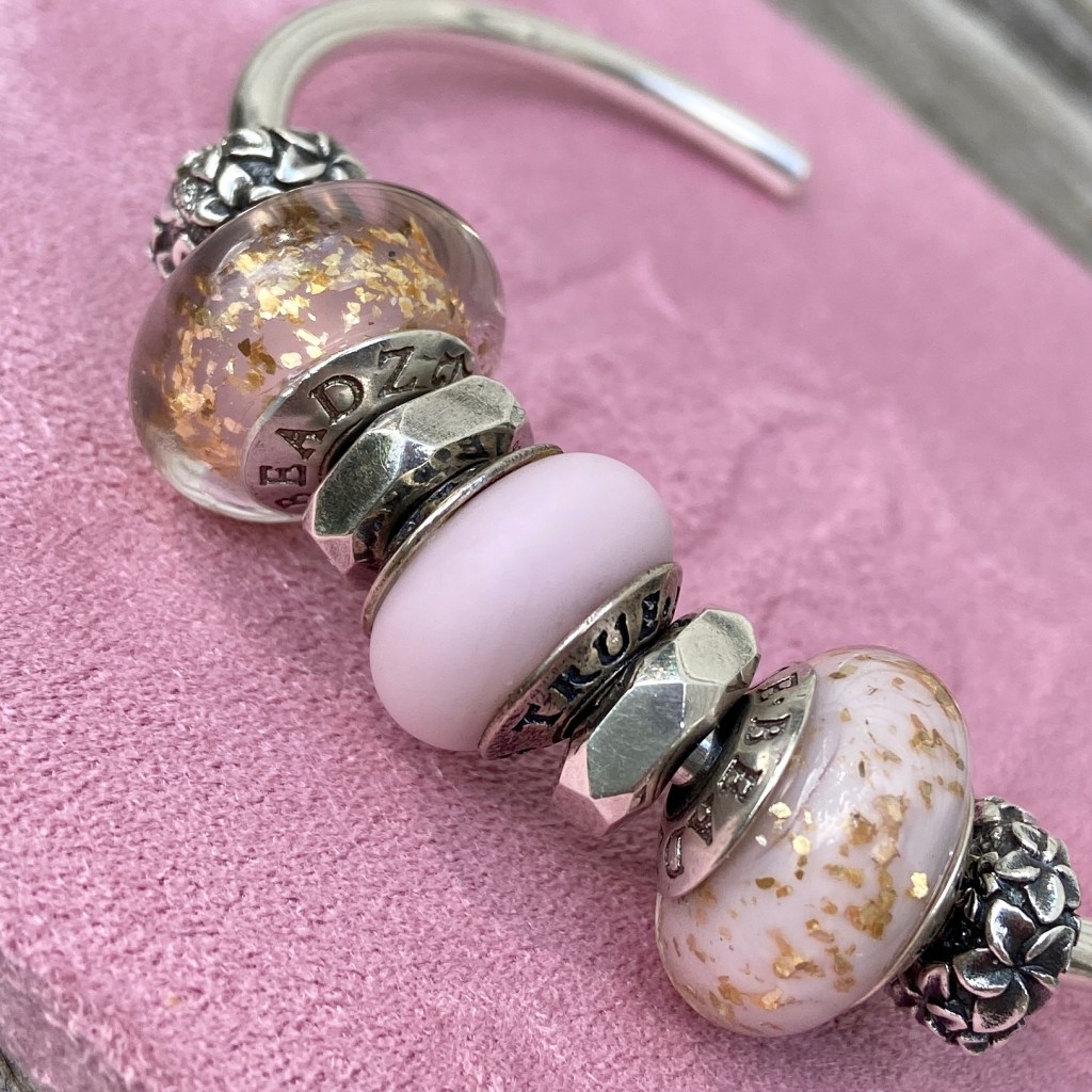 At the last True Beadz online event, I saw some beads that had me drooling. Someone else snapped them up before I could buy them (you know who you are!😀) and so I asked Julia if they could be replicated in the Made to Order purchasing option. The beads had an ivory base with the Marmor coloured glass in a blossom. They are so beautiful!