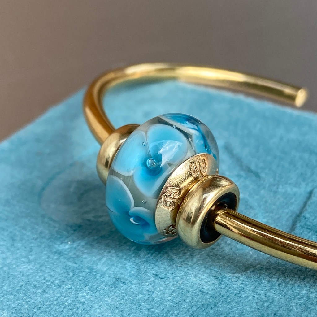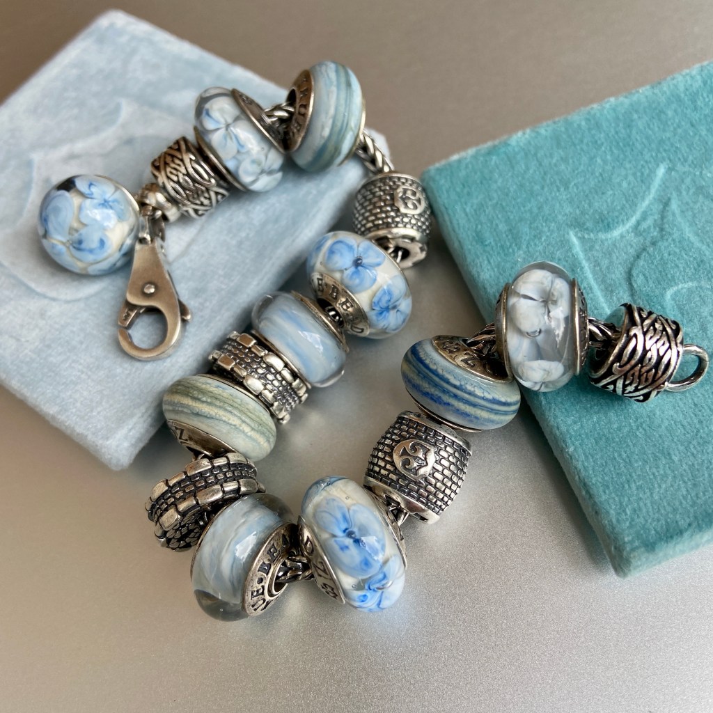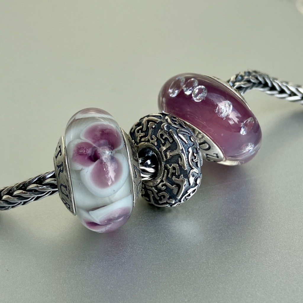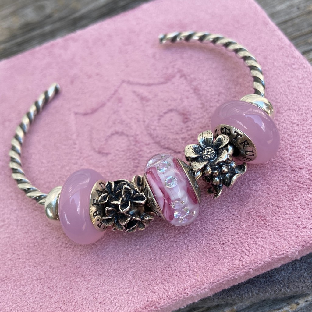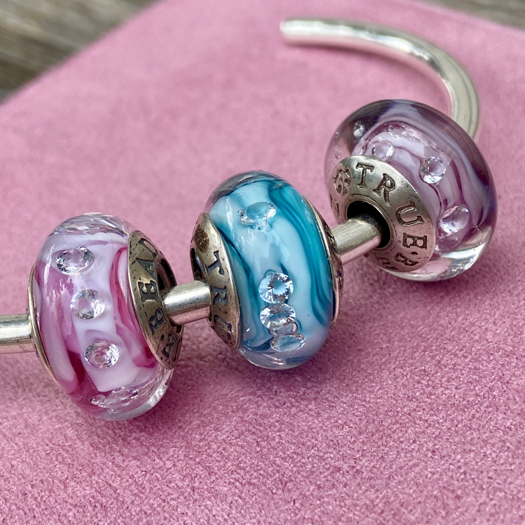 At the last True Beadz online event, I saw some beads that had me drooling. Someone else snapped them up before I could buy them (you know who you are!😀) and so I asked Julia if they could be replicated in the Made to Order purchasing option. The beads had an ivory base with the Marmor coloured glass in a blossom. They are so beautiful!
