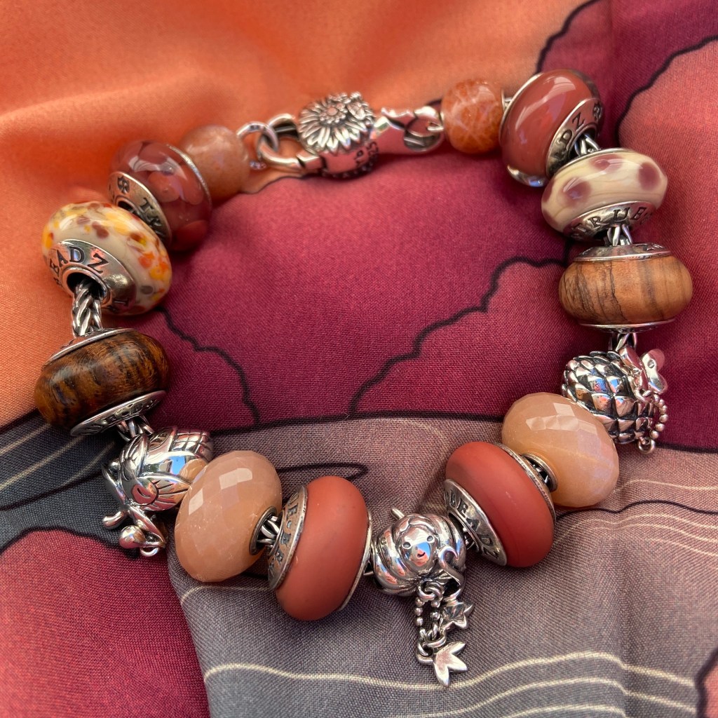 a very lovely collection of silver beads, my favourite would be the Pine Cone Fairy with the sweet little butterfly which it seems to me attaches with a magnet. You paired these beads so well with the soft colours of TrueBeadz for a perfect fall bracelet.