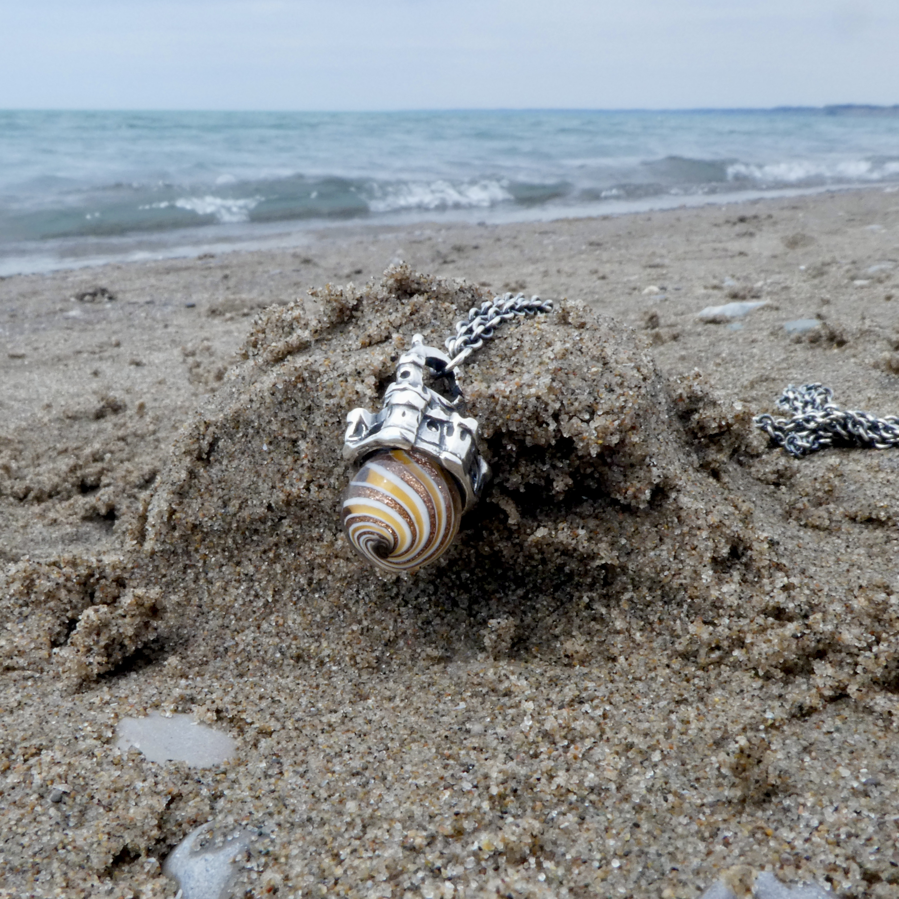 Louise Rimpler has designed a playful pendant. The glass part is so beautiful with its swirls of colour. The Sandcastle Pendant is $105 USD/ $126 CAD. Build the most majestic castle on the beach. It clips onto the Changeable Fantasy Necklace, looks great on a leather necklace or could be worn on a bracelet.