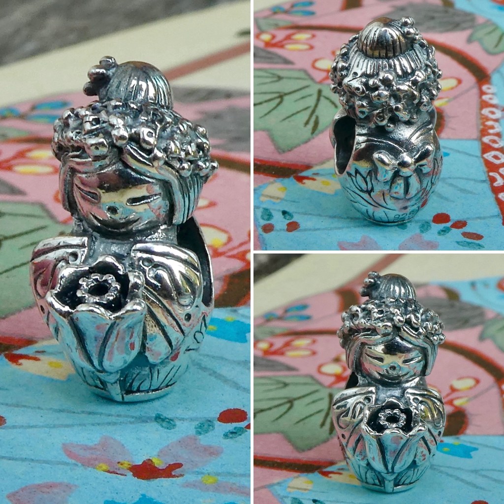The first Flower Kokeshi with a Narcissus pairs beautifully with her new tulip friend. The beautiful yellow and glass silver bead is from Aurora Charm and is called Hiva Oa Island.