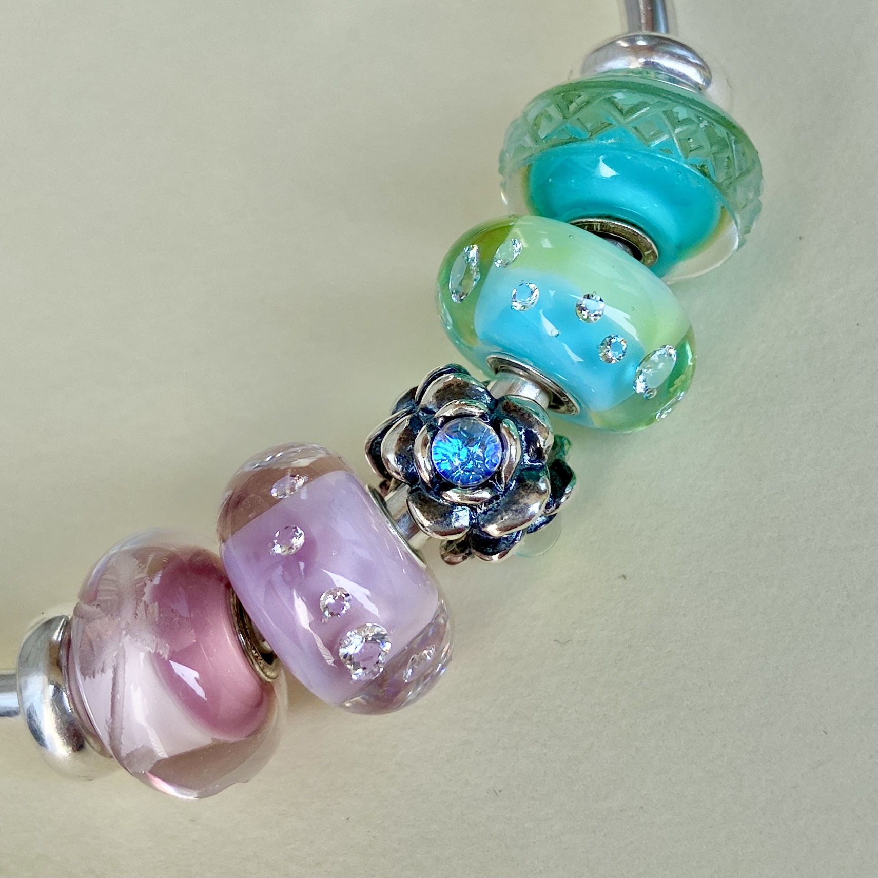 The Rose and Lagoon beads made me think of the Plum Tree and Mint Mesh beads from the Trollbeads Day 2000 kit. They aren’t an exact match, but look nice together.