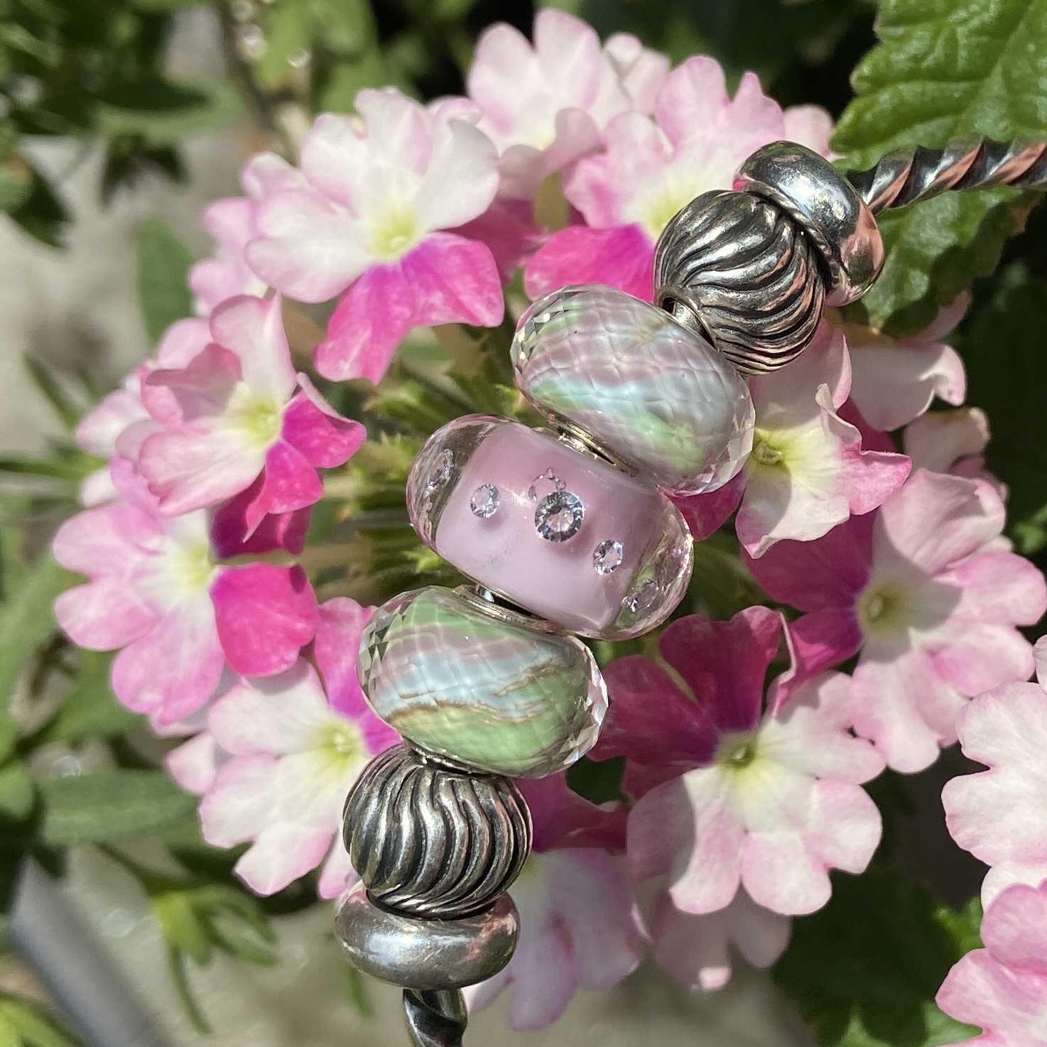 When I opened up the samples, what struck me at first glance is that the pink in the Peach bead is just like the base colour of the China exclusive bead. Also, the grey of the Silver bead is not as pronounced as I was expecting. That’s okay though, as it’s still super pretty. Just be aware that if ordering online it might not be as dark as you think. I strive to take all of my pictures outside, so people can really get a feel for what the beads will look like at home. I don’t like the feeling of being disappointed after buying something from live images. Sometimes artificial lighting makes colours pop. Having said that, glass always varies and so my samples are not necessarily reflective of all the beads available. (You should have seen me in a Pandora store recently trying to explain to the salesperson that glass beads are all different because they are handmade. I wanted to see the three glass beads they had but was being told that all glass beads are the same. Argh!) Anyway, the Lagoon is super pretty and reminds me of the long retired Luminous Ohm Bead (just Google it and you’ll see what I mean). My early favourites are definitely the Rose and Pacific beads, and I might buy them at some point in order to have doubles.