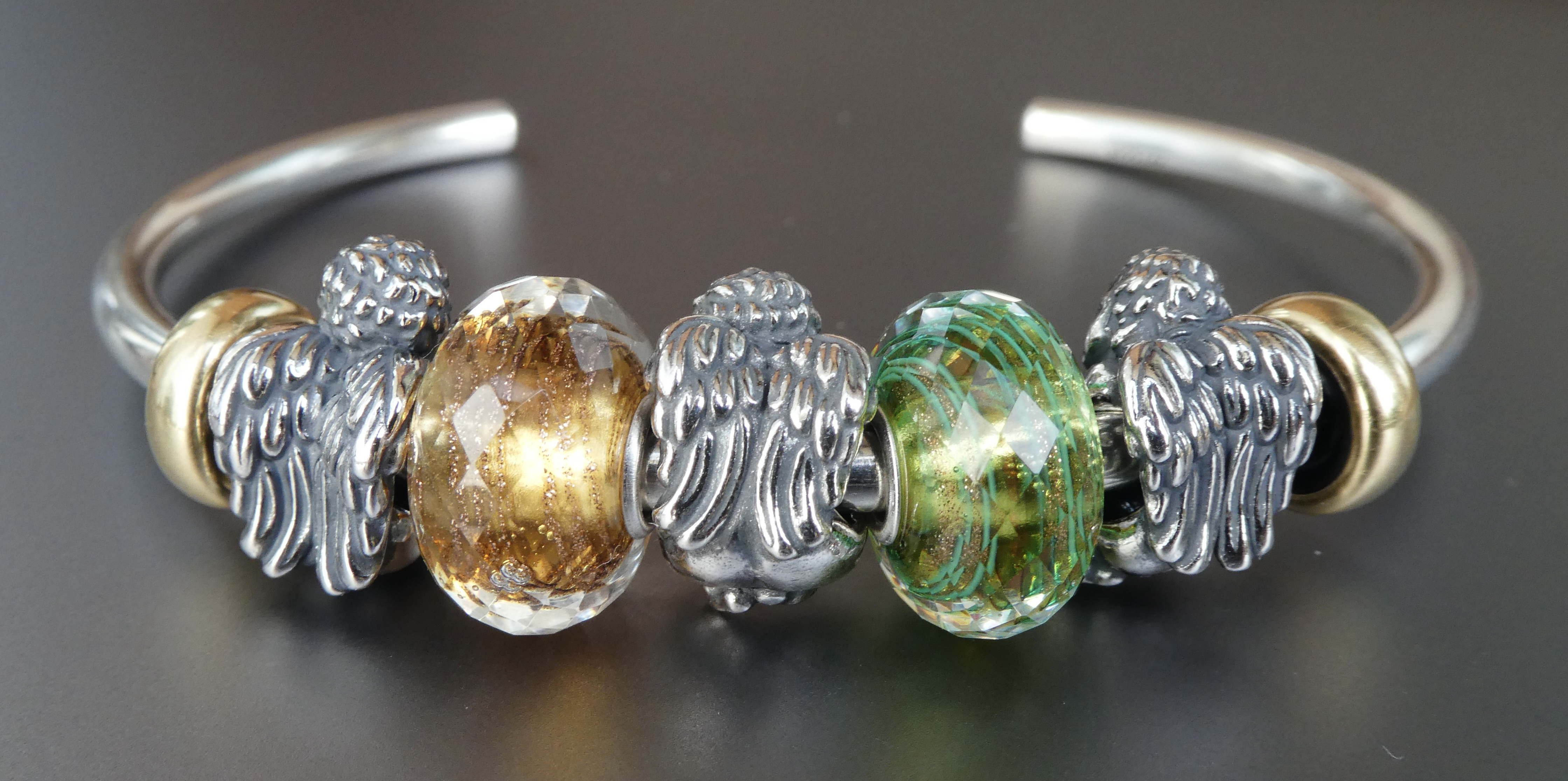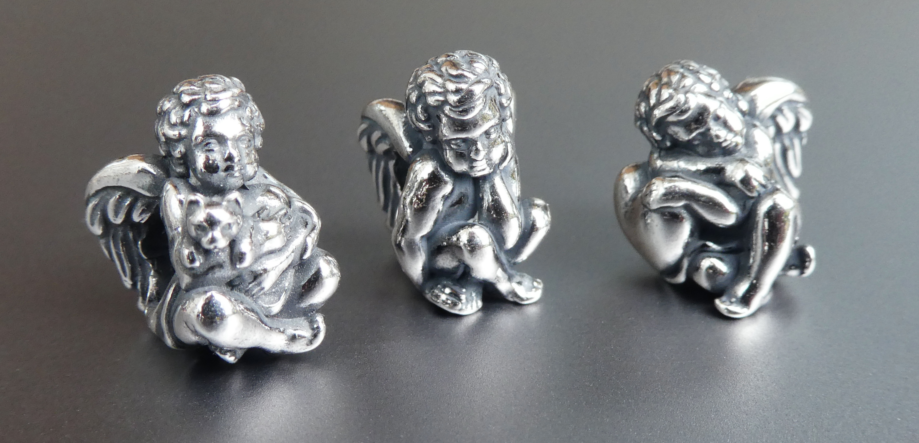 There are four silver beads and a silver spacer designed by a new Trollbeads designer, Anatoliy Kurityn. Each cherub costs $83 USD/ $95 CAD. The cherub below left is called Cherub of All Living. Enjoy the love for all animals. In the middle is Cherub of Reflection. Enjoy thoughts, reflection and understanding. On the right is Cherub of Love. Enjoy the sweet message of love.