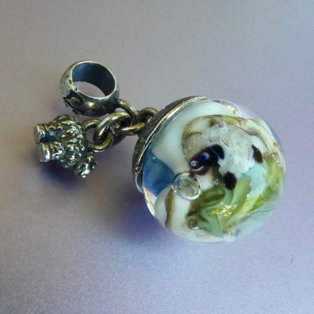 There are also two glass beads in the Mountain View collection, a dangle and a bead. The bead is called Mountain View and can be made in several colours and with or without a murrini sheep. By choosing colours for the sky, you can have the bead represent a sunset or clear day, whatever suits you best. The dangle can also be made in different colours and with or without a little murrini sheep. So cute!