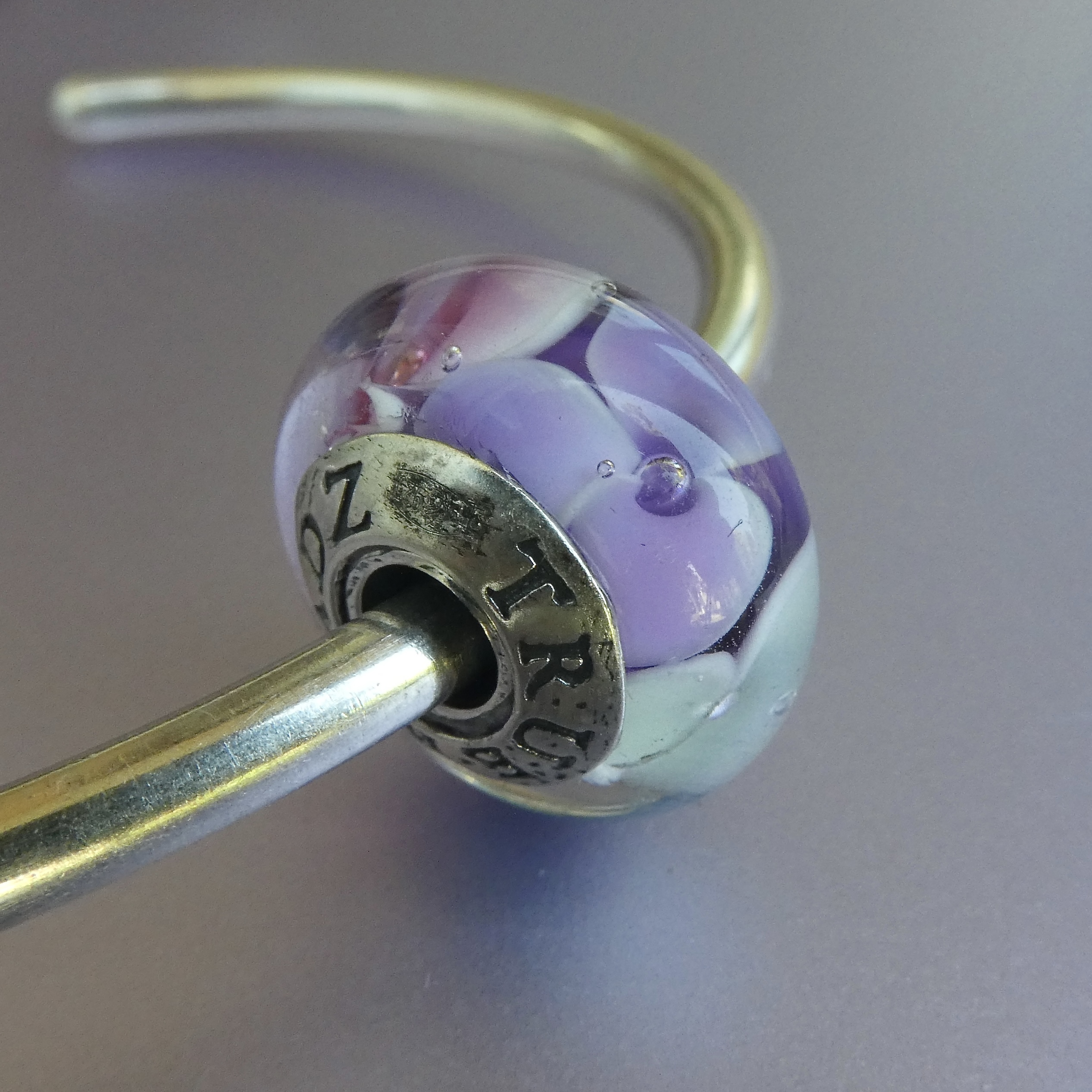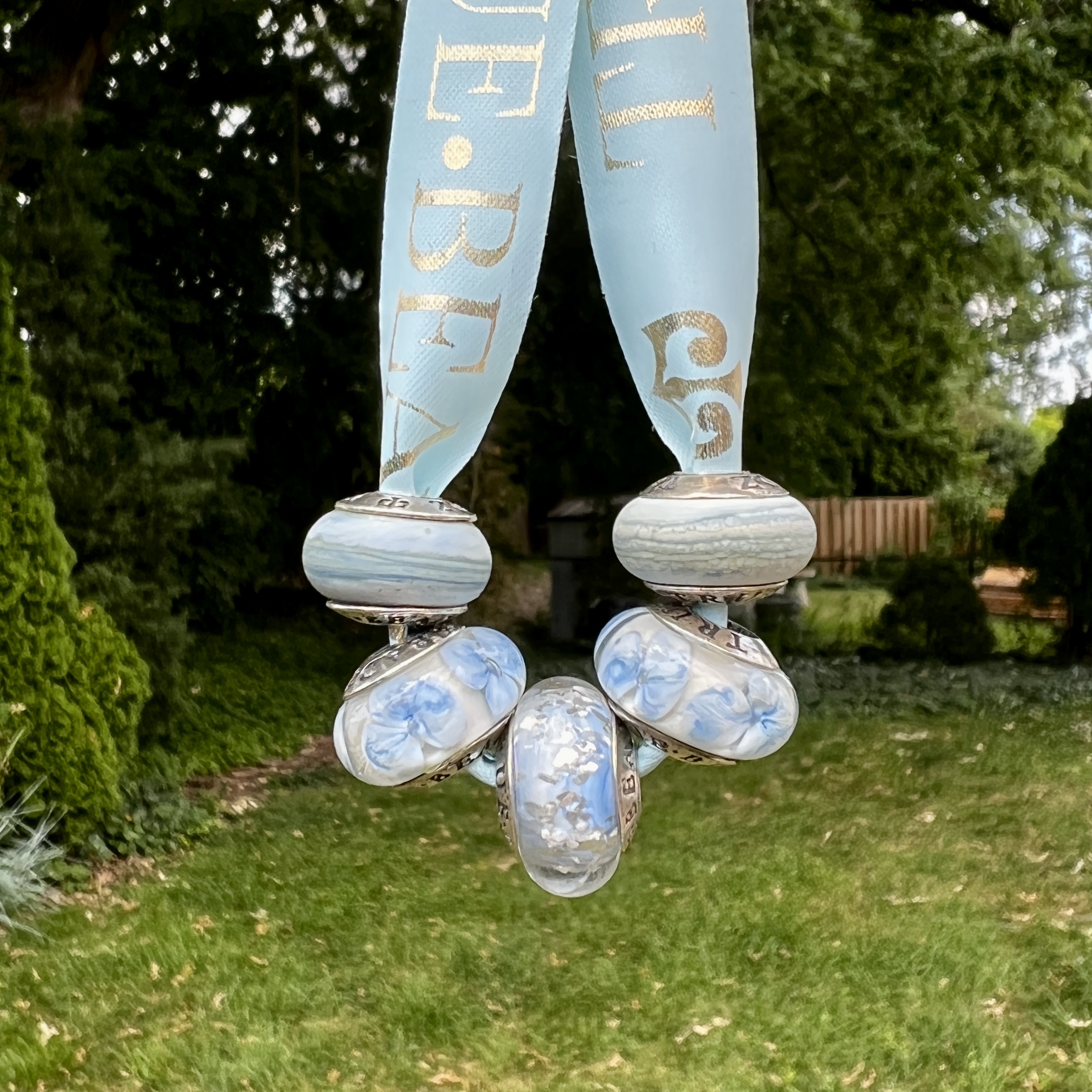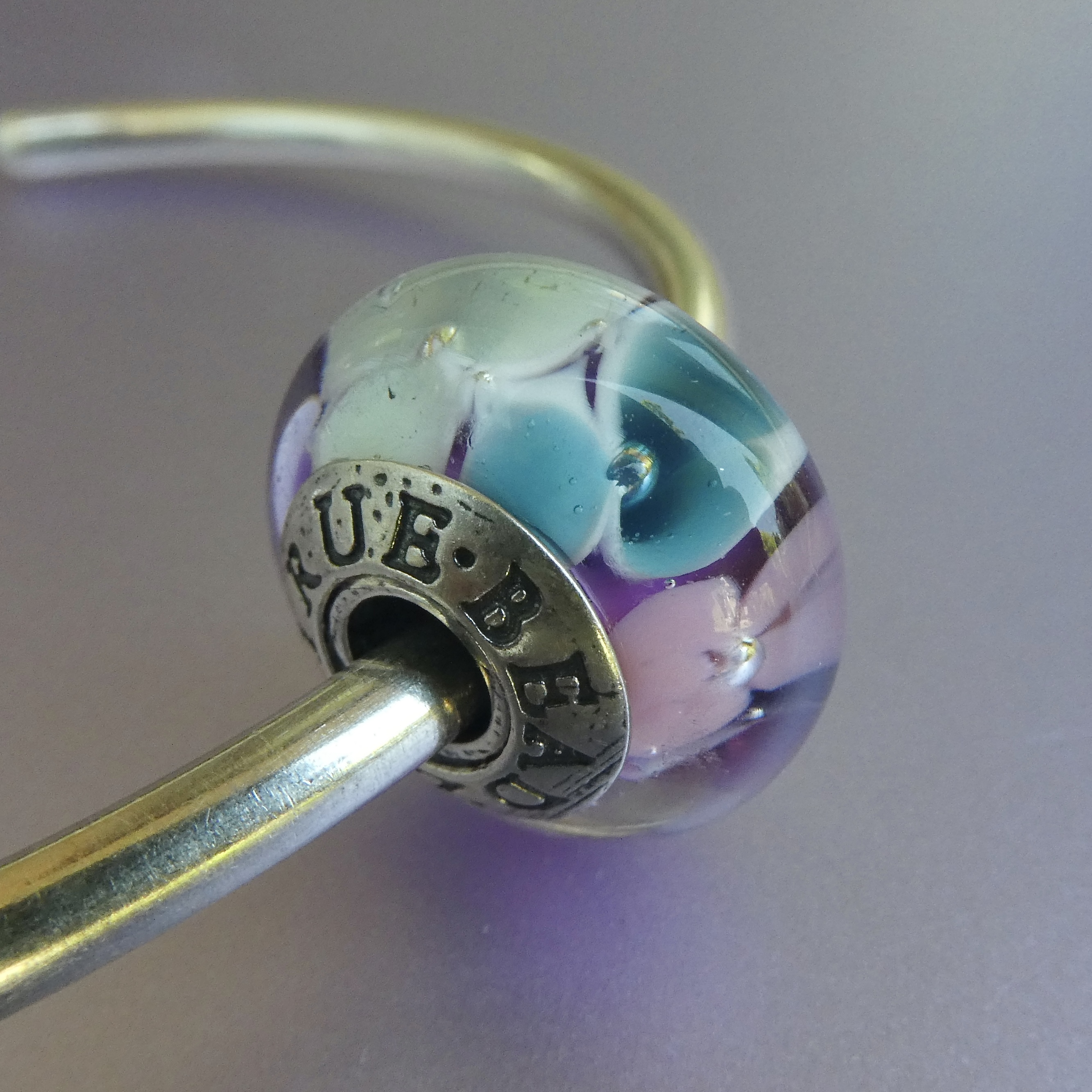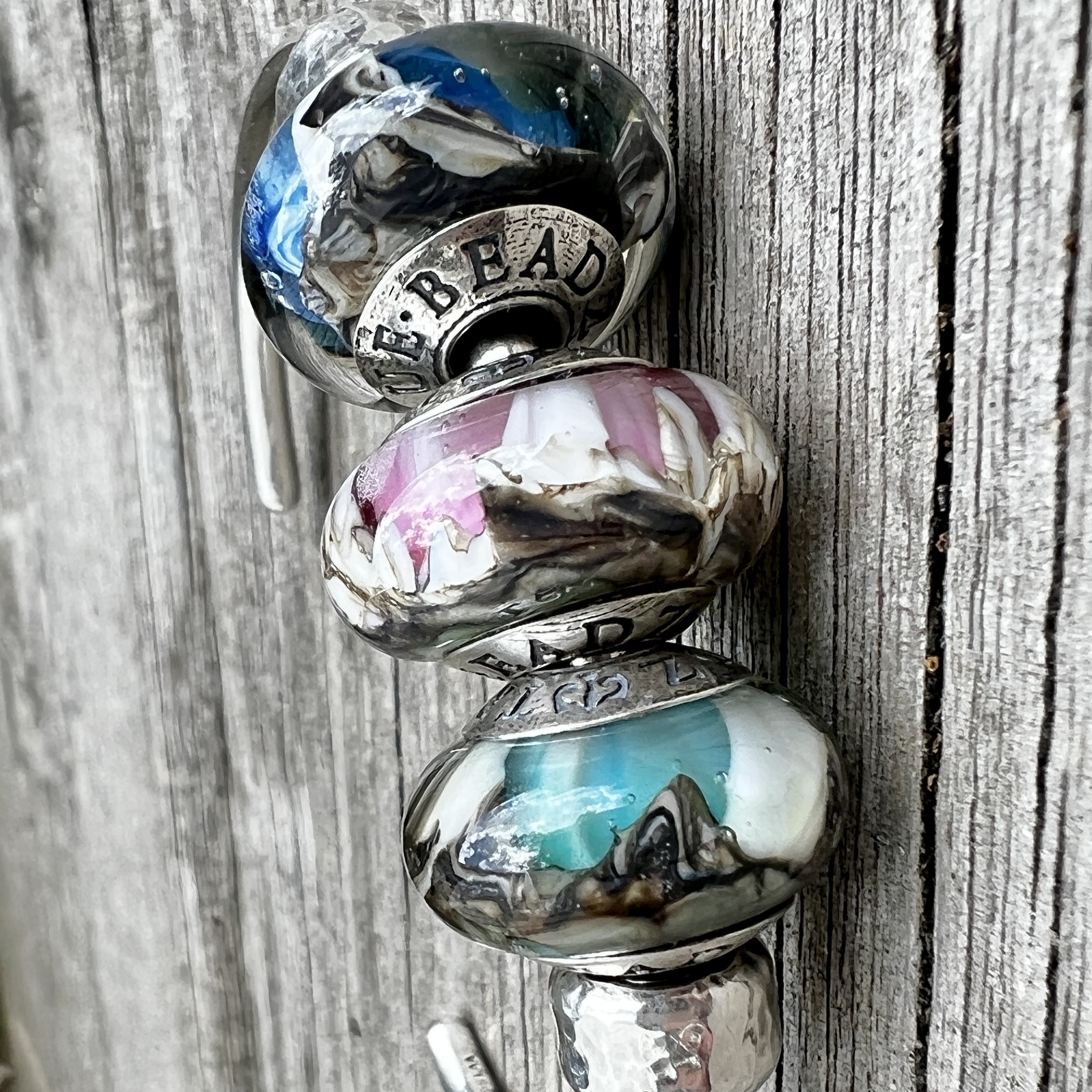 Recently, I received beads as samples from the new Mountain View collection from True Beadz, as well as a few Made to Order (MTO) beads that I purchased. I find the Made to Order events very addictive. It’s fun to try out new colour and finish combinations. This time I ordered a Marmor bead with silver flakes. I adore the Marmor colours and have quite a few variations now. Here is the bead with silver flakes along with my beloved True Touch Marmors and MTO Marmor Blossom on Ivory beads.