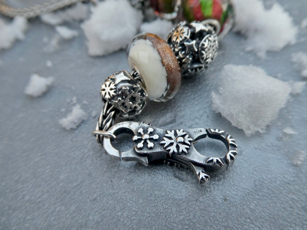 There are two new clasps, one of which I have to show you today. This one is called Stay Together ($72 USD) and it has lovely snowflakes all over it. One thing to note is that this clasp is flat, not twisted. It was made to be used with new necklaces (not pictured) but I tried it and it works fine on a bracelet. I’ll be using it a lot this winter as I find flat clasps to be most comfortable for working on a laptop at work.