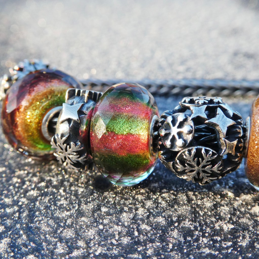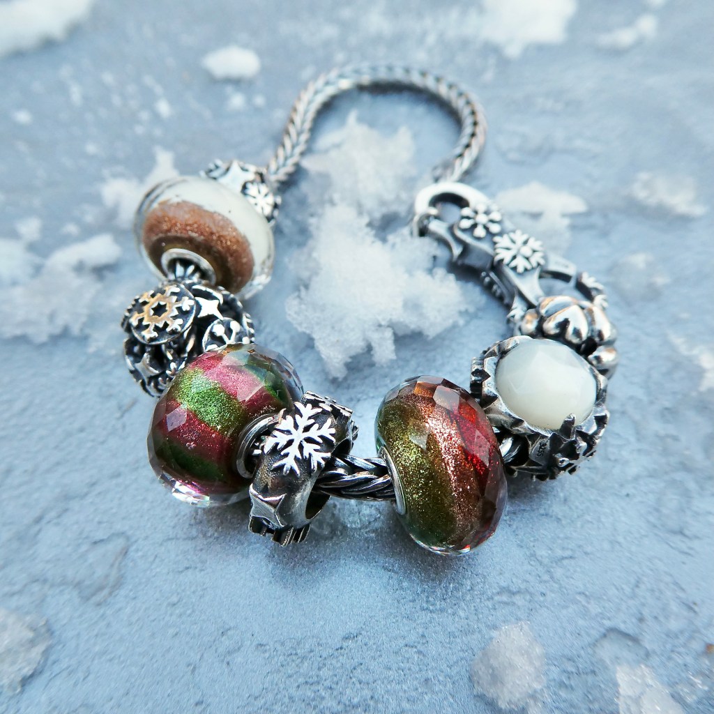 There’s also a larger silver bead called Snow Kisses ($72 USD) and a silver spacer aptly named Snow Spacer ($50 USD). The two glass beads pictured below are called Season of Joy ($61 USD) and Warm Wishes ($61 USD).