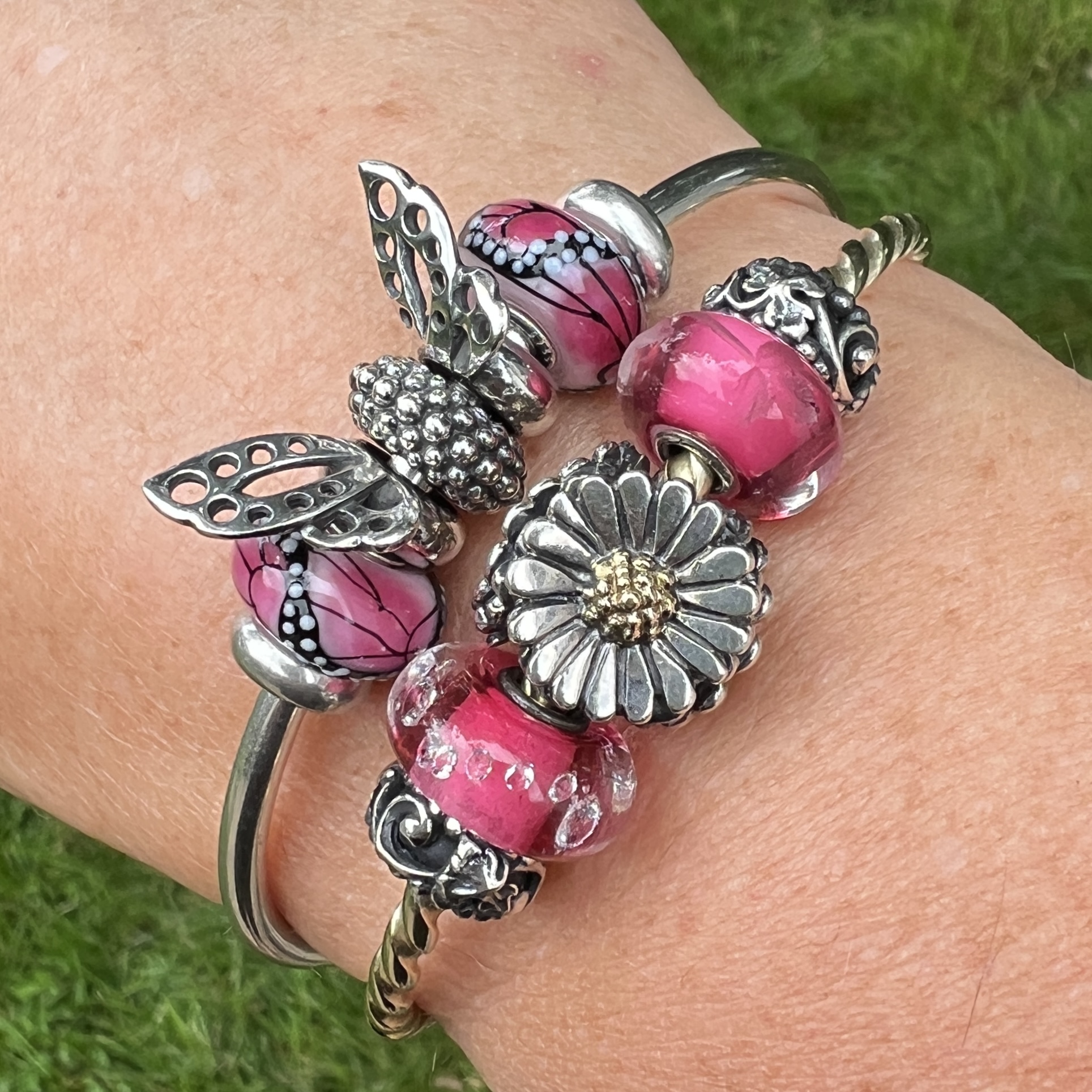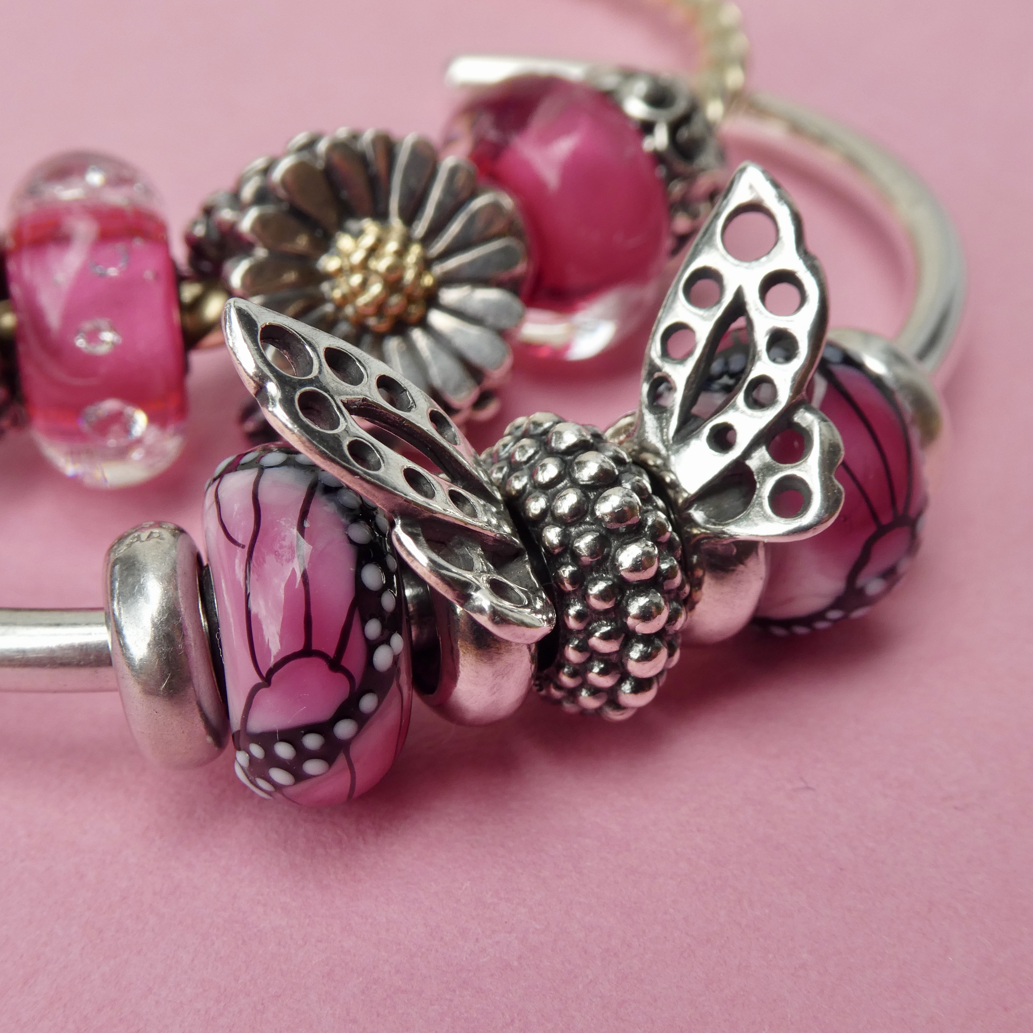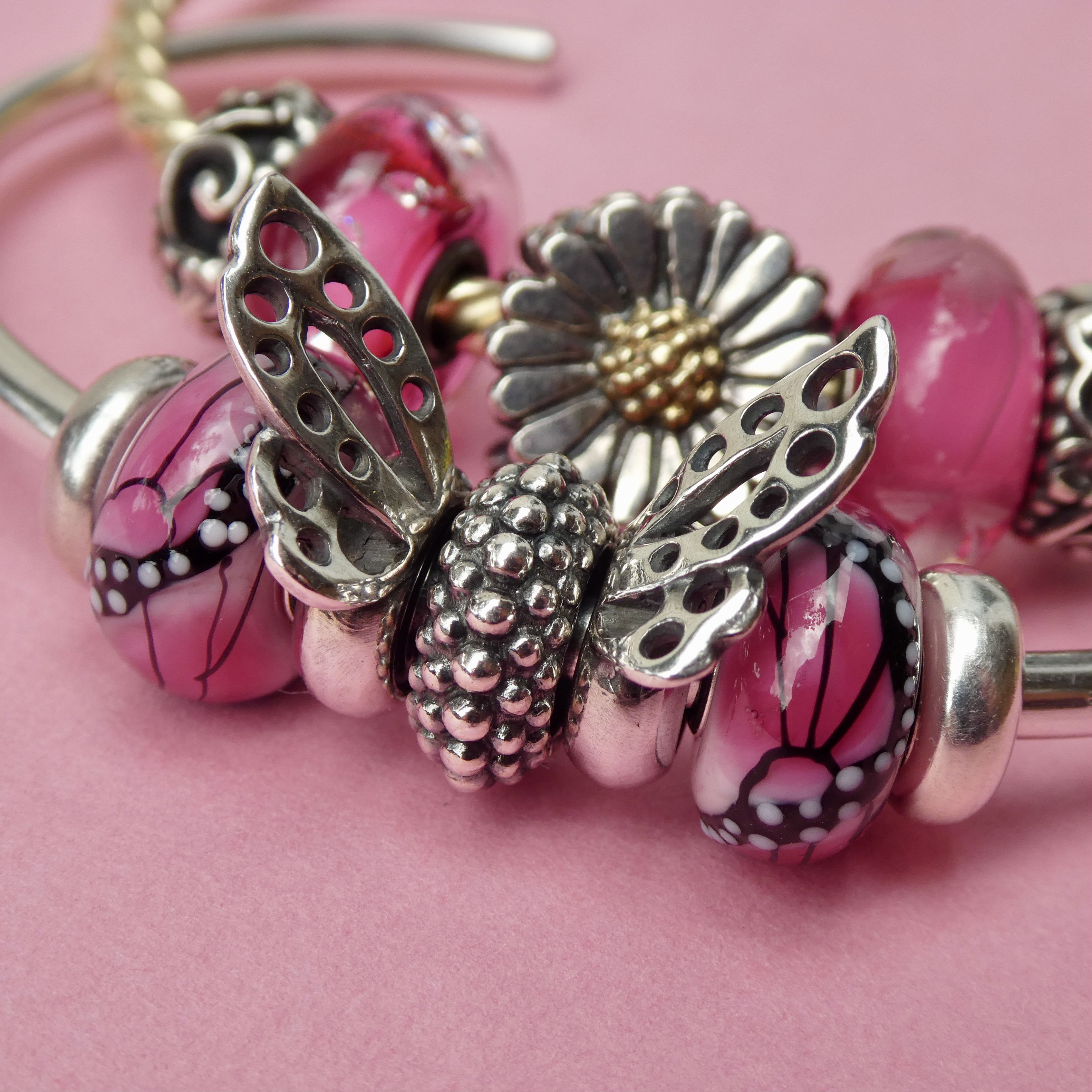 The Dancing Butterfly Spacers are retired, so are likely hard to find, but I couldn’t help but use them to go with the glass beads. I did see them on the Trollbeads USA website yesterday, but not the Canadian website. By the way, I hope that Canadian collectors all got the email from the company explaining how orders will now be shipping from the USA, but that the company will be taking care of the duties. Always good to know for when shopping online!