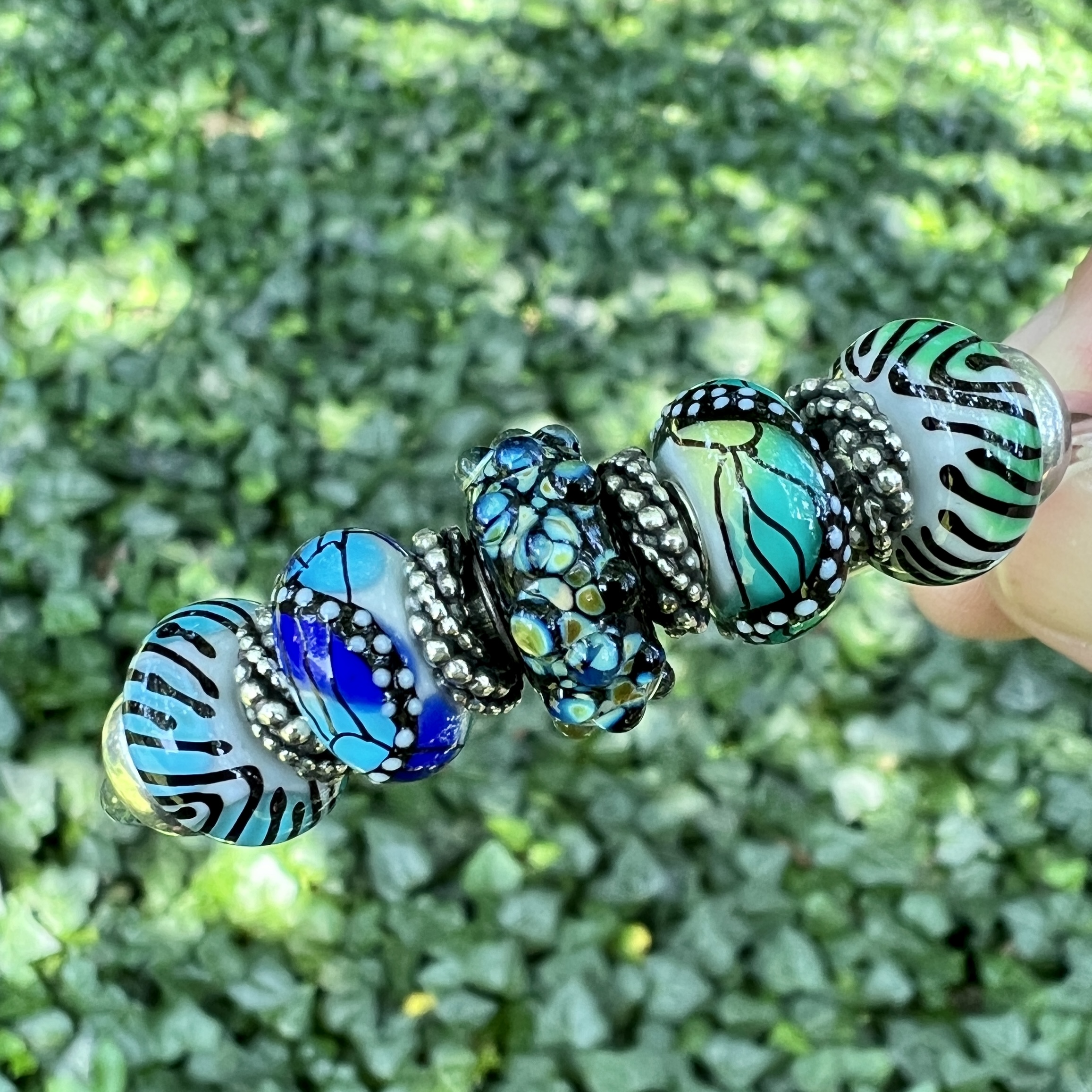 A collector in a Facebook group suggested that the green and blue butterfly beads might go well with beads from the Enchanted Animal Kit from 2018. Indeed, I think they look great together. If you ever can’t find a bead because you don’t know the name, it works well to go to Beads>Glass, then select the Filter to search by colour. That’s how I found that the first bead on the left is called Topaz Tiger and the bead on the far right is called Emerald Tiger. The bead in the middle is the fabulous Milan Bead. I think it ties them together really well!