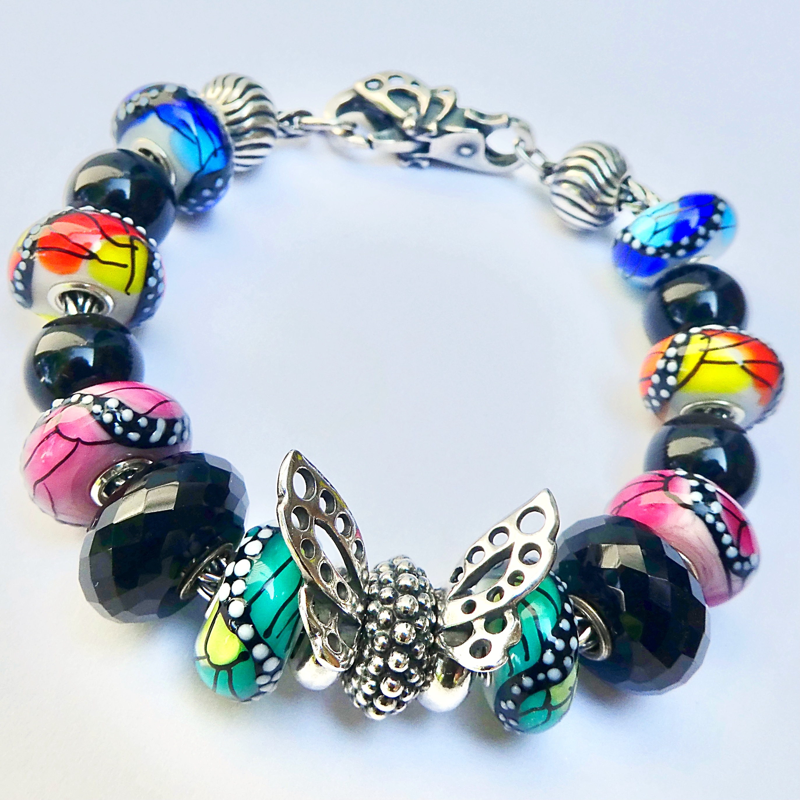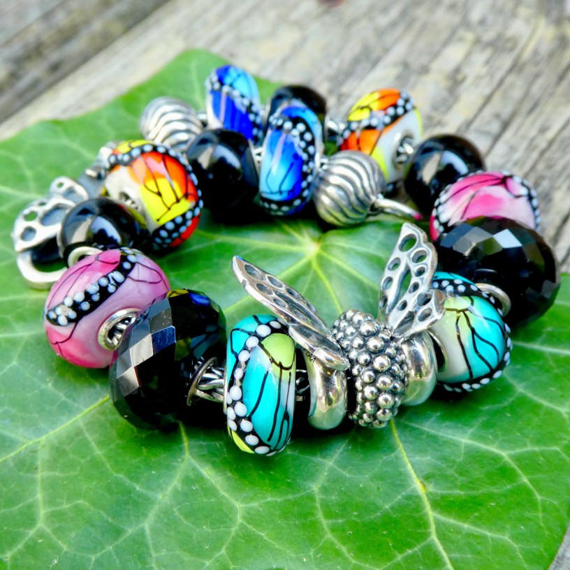 Today I’ve got a short blog post with some pictures of the four new butterfly beads, designed by Tenzin Phuntsok and Kalden Chophel. They are completely opaque, which I know will really appeal to some collectors. They each have a name, but I think of them by colour: Wings of Energy (orange), Wings of Success (green), Wings of Serenity (blue) and Wings of Passion (pink). Trollbead accidentally sent me the set two times, which is why I have doubles. Honestly, pairs of beads make it so easy to work with, so I’m not going to complain! Since these beads are pretty intricate and busy looking, I put them with simple black stones to make a complete bracelet.