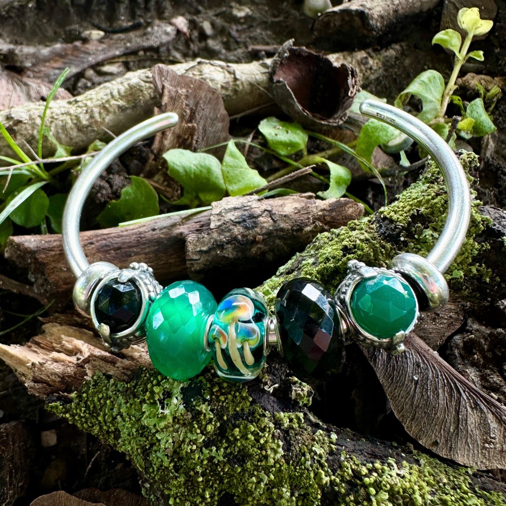 Moving on to our green section of photos, the new stone this season is Green Onyx. It’s absolutely beautiful. It really changes colour according to the light. It has a mate in the silver/green onyx bead called Calming Shelter. The other mushroom bead I received fits in well with the greens and is called Mushrooms of Poise.
