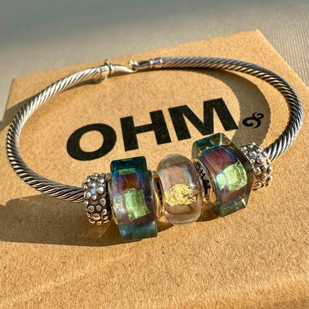 I did take advantage of OHM’s promo and bought the twisted bangle 2.0 version which came with two free glass beads. I couldn’t pass that up. I am loving that you can add other brand beads on it. For sizing- My wrist size is 6.5, I ended up buying the medium – next time I will get the small. The medium will hold a lot of beads, and still fit loosely on me. A small on me will comfortably hold about 3. I’ll keep the medium, but for all others-small will do. I guess it just depends on what people prefer, a full bracelet of beads, or a few focal.