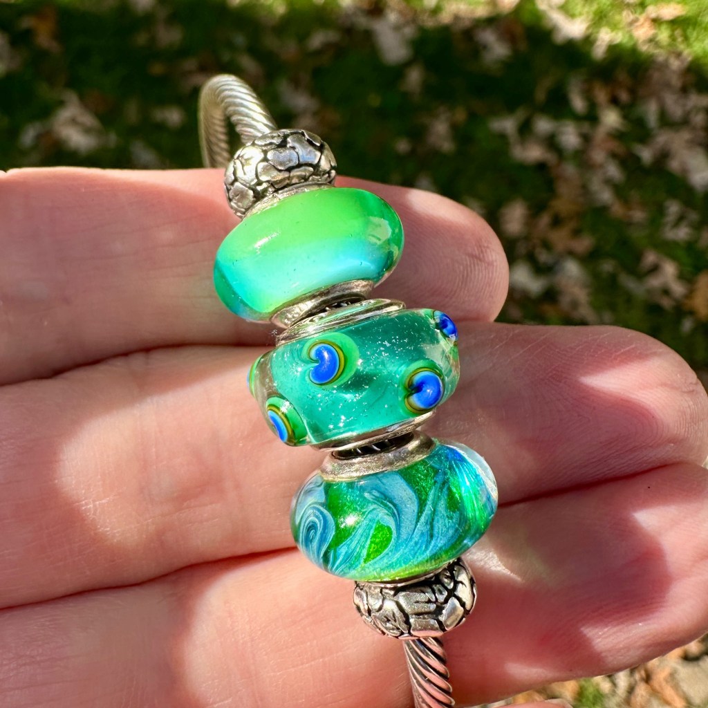 Lastly, the glass bead called Ethereal Tribute has some glitter and touches of a peacock’s plumage. The colours are perfectly matched with some older OHM Beads that I bought when I first started collecting.