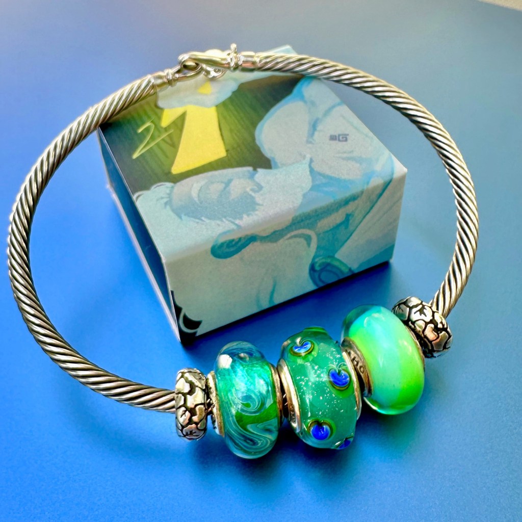 The original OHM Twisted Bangle was my favourite bangle for years. With its oval shape, it fits beautifully on the wrist and then the hook closure ensures it won’t fall off. It’s no wonder they are coming out with a new version on November 5 and this one is even more versatile since it will fit small cored beads, such as Trollbeads. Also, a variety of stoppers from brands like OHM, Trollbeads, True Beadz and Redbalifrog fit on it very easily. This picture below shows the bangle with True Beadz stoppers, two glass beads from OHM and in the middle, a Trollbead.